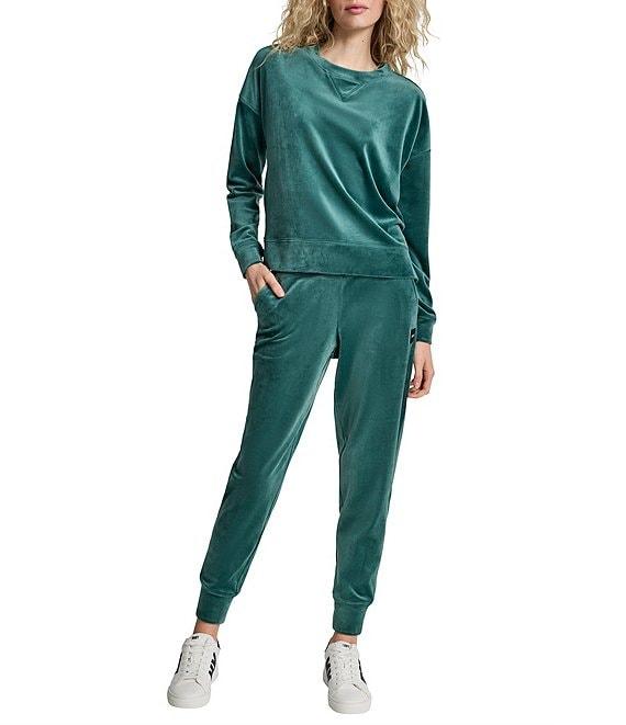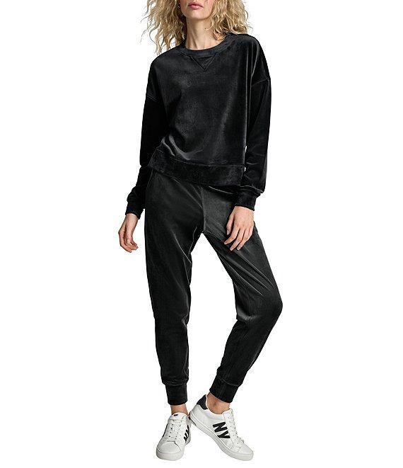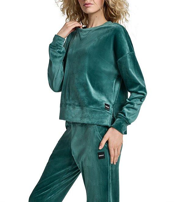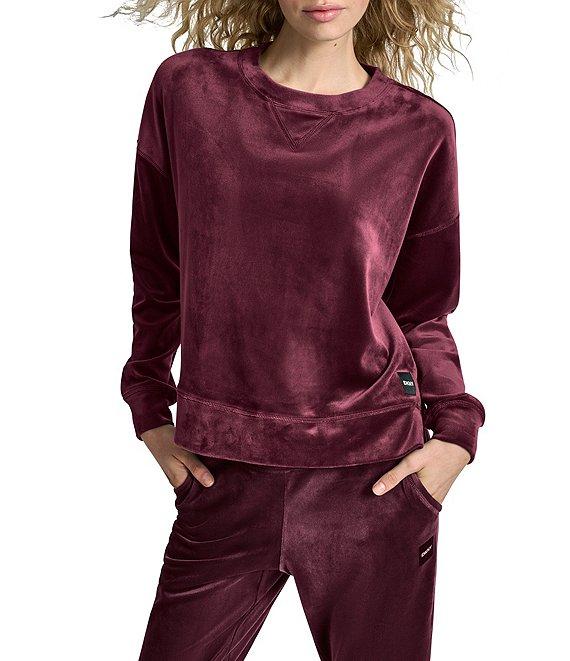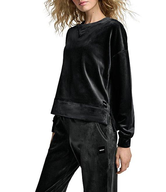 From DKNY Sport by Donna Karan, this sweatshirt features: Velour fabrication Crew neckline Long sleeves Metallic logo patch High-low hemline Pullover construction Approx. 22.5" front; 23.5" back length Polyester/cotton Machine wash Imported.