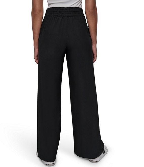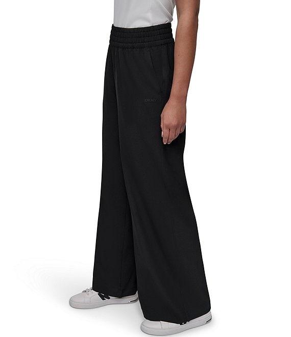 From DKNY Sport by Donna Karan, these pants feature: Hudson stretch fabrication Wide leg Smocked waistband with encased elastic Front slash pockets HD logo heatseal at wearer's left pocket Pull on construction Approx. 30" inseam Polyester/ spandex Machine wash Imported.