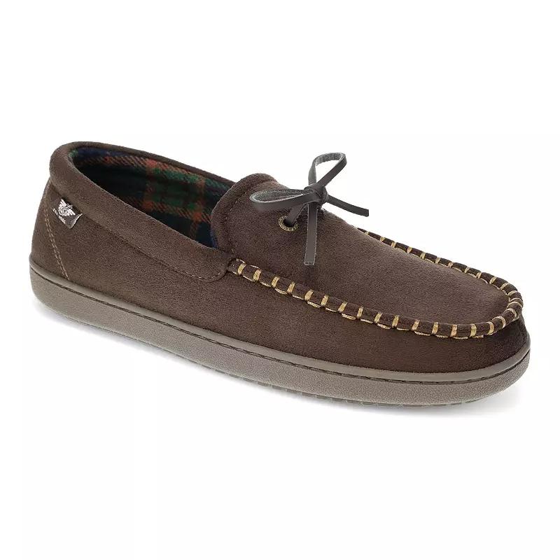 Dockers delivers cozy comfort for any season with this stylish moccasin slippers. This style features the classic moccasin design with a slip-on, lace-less construction. The Dockers detailing adds a splash of style and the soft upper sits comfortably against the foot with or without socks.