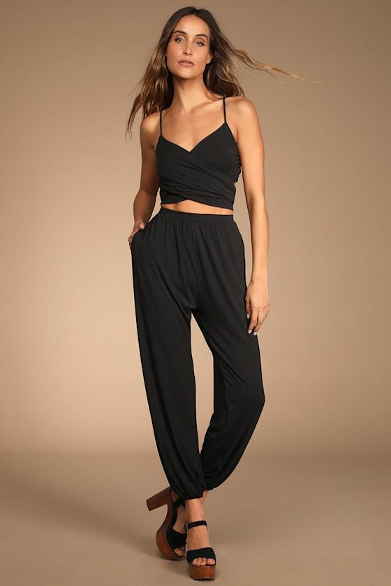 You know you're onto something good when you're wearing the Lulus Doin' it Right Black Wrap Two-Piece Jumpsuit! Soft jersey knit forms this two-piece jumpsuit that features a wrapping crop top with an overlapping neckline and adjustable spaghetti straps. Wide ties wrap around the midriff and can be tied at the front or back. The matching jogger-style pants have a relaxed fit, shaped by straight pant legs (with bonus side seam pockets!) with gathered elasticized cuffs.