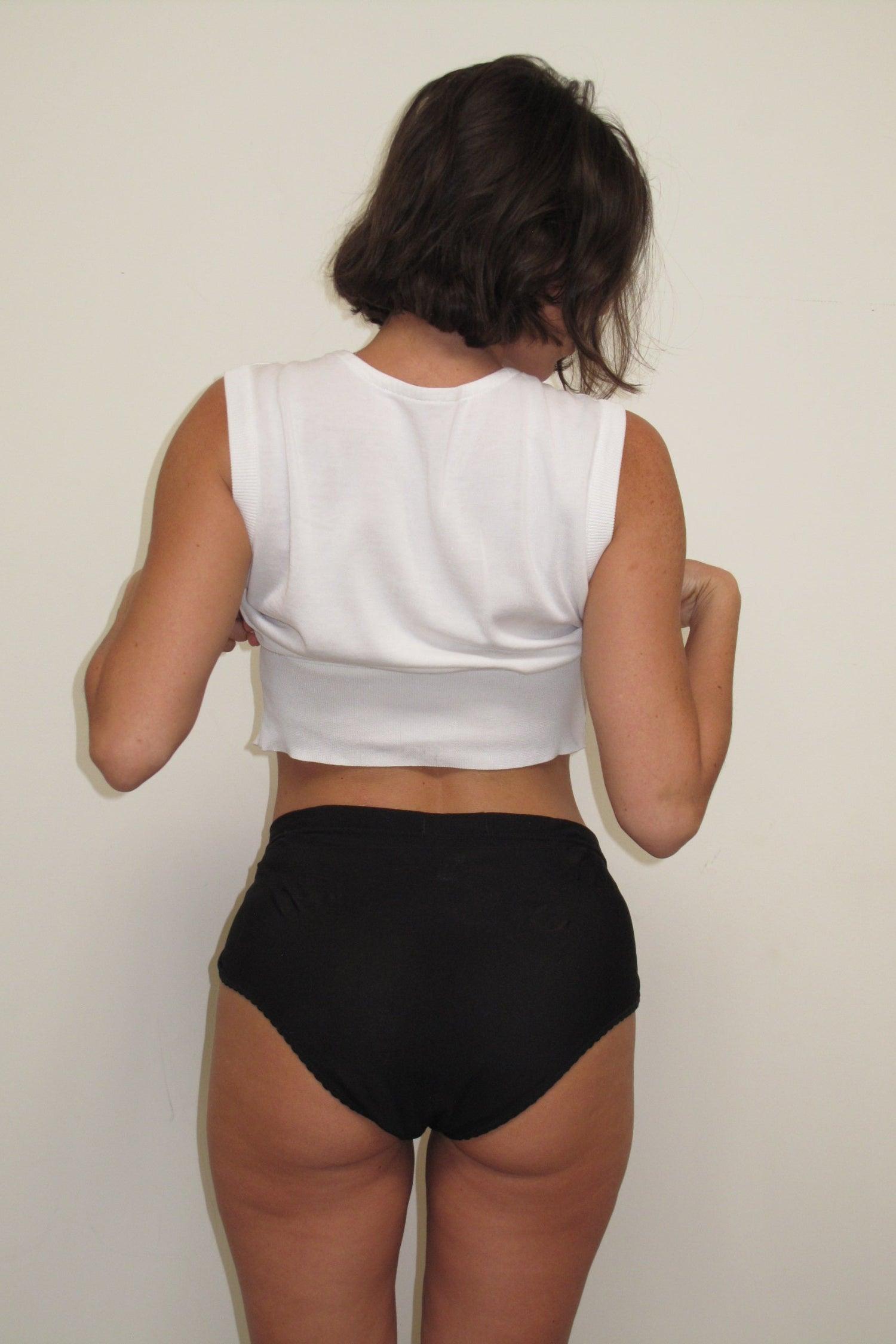 A high-waisted vintage Dolce & Gabbana brief in sheer black. Soft, sculpted, and perfect under or over everything. Perfect to wear with tights and a sweater.