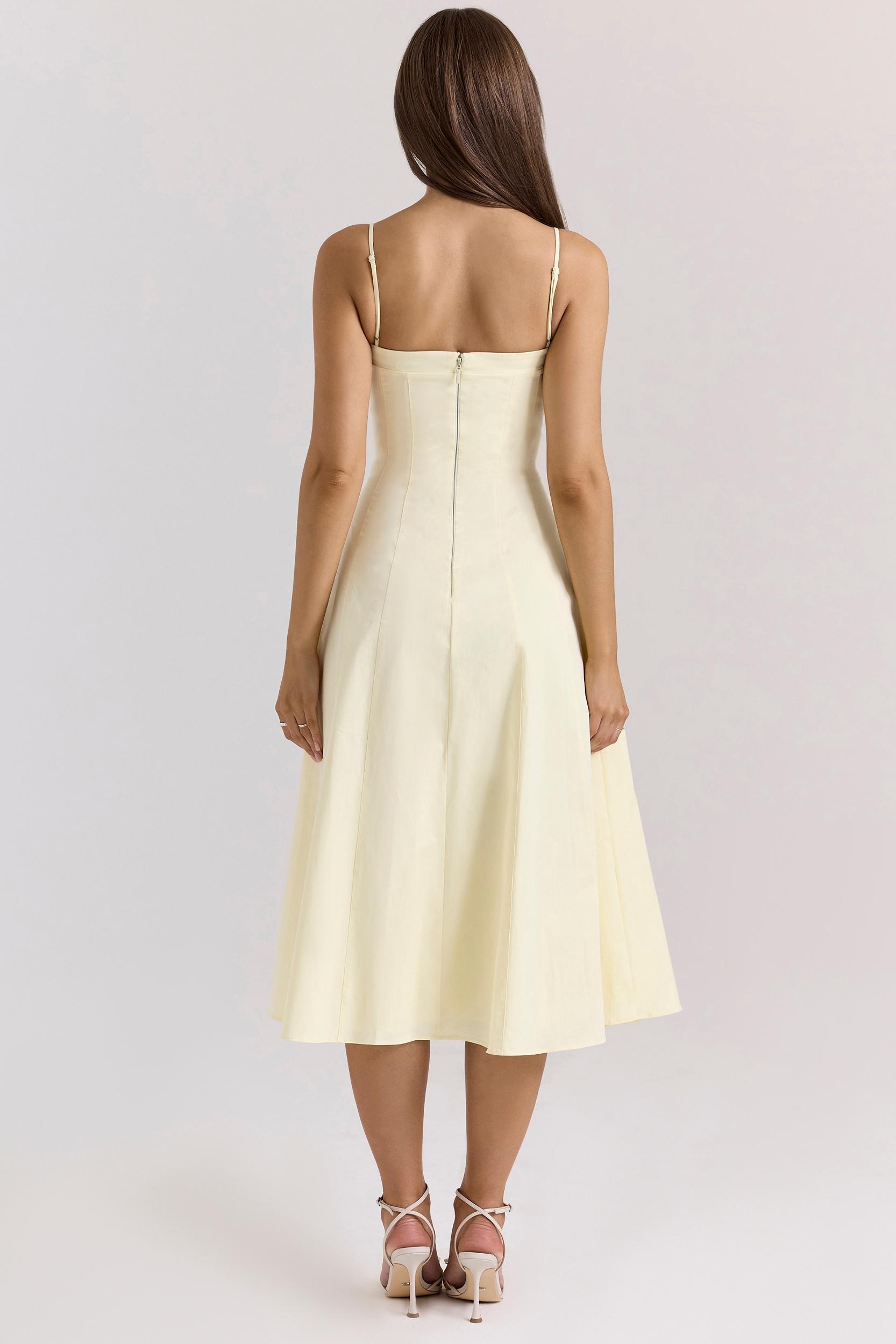 'Dolly' feels just like a fresh ray of sunshine. The soft lemon stretch cotton is cut to a vintage-inspired silhouette - it's a simple fit and flare shape that beautifully frames the body and zips at the back. Elegant volume continues in the skirt with plenty of movement guaranteed and two handy side pockets. The final additions include a delicate trim on the bustline and dainty straps. It's just as sweet as it looks, making it the perfect dress for those sun-soaked days you wish would never end.