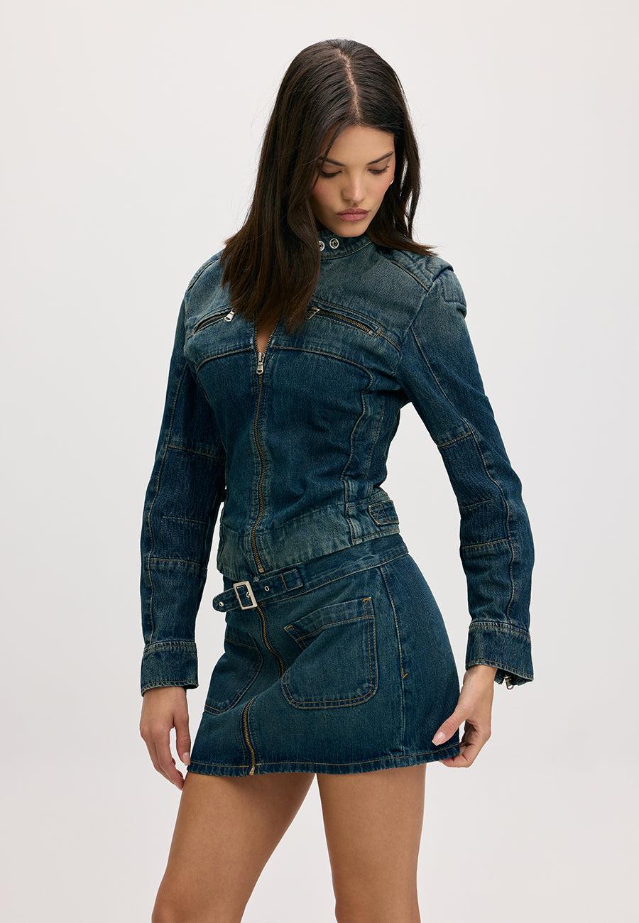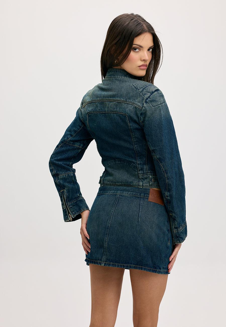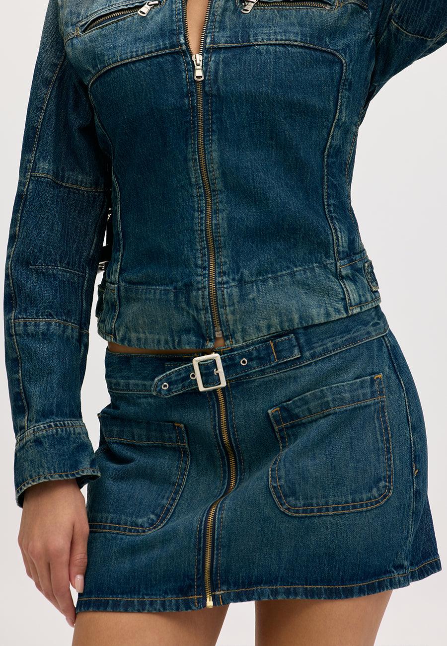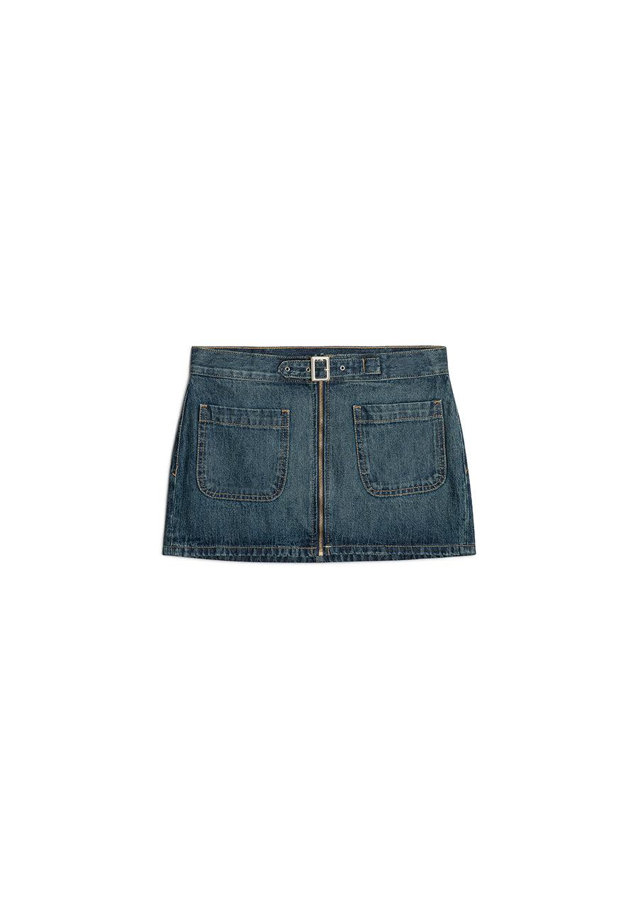 The Dolly Skirt redefines the denim mini with its high-rise waist, flirty A-line silhouette, and signature button-front and belt closure. Finished in a rich ocean-blue wash with subtle fading and crafted from comfortable stretch denim, it’s the perfect piece to elevate any wardrobe.