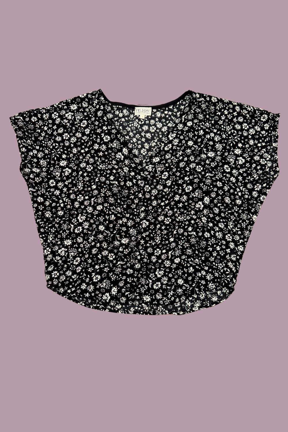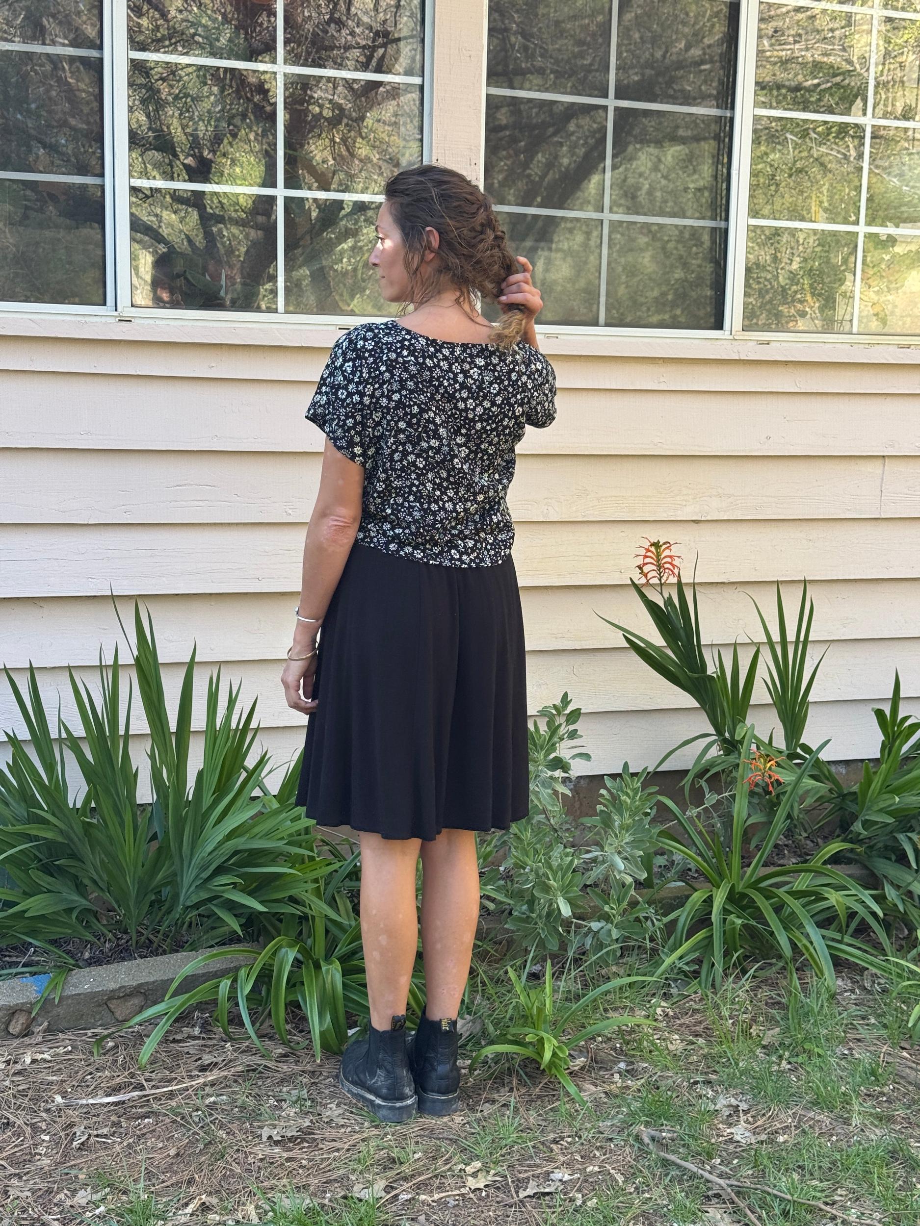 Made from a deadstock soft crinkle rayon crape with a beautiful drape and black and white flowers.