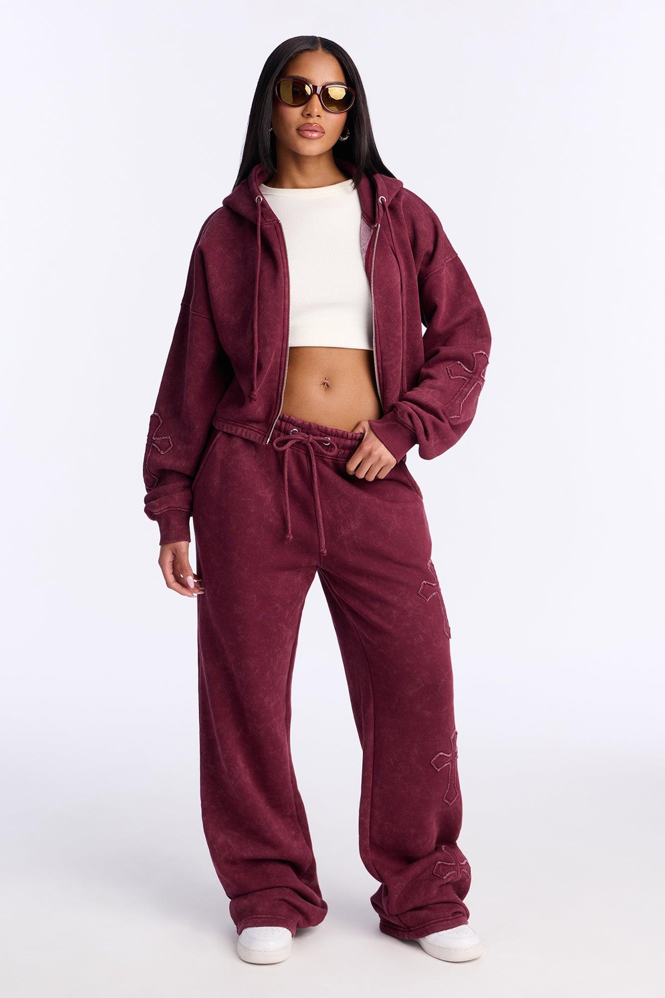 Available In Burgundy And Stone. Lounge Zip Up Hoodie Stretch Cropped Embellished Pair With "Don't Cross Me Washed Fleece Lounge Pant" 60% Cotton 40% Polyester Imported