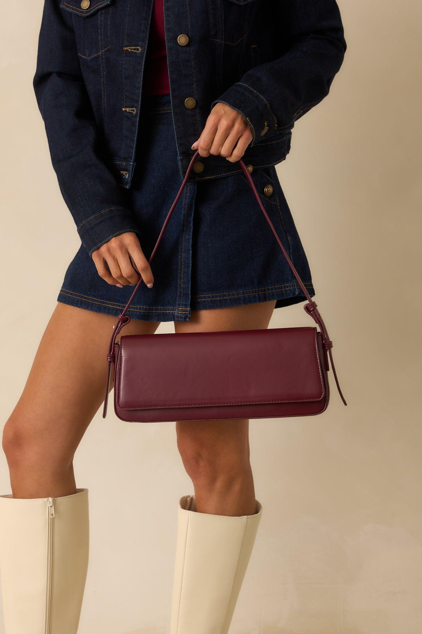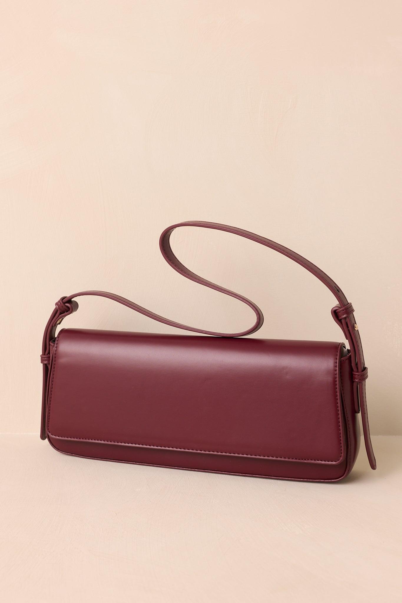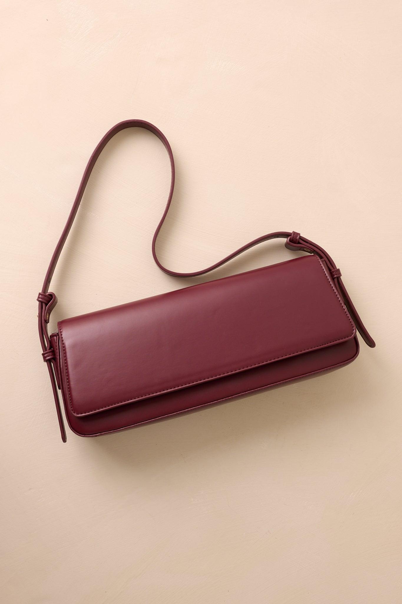 The Don’t Doubt Me Burgundy Faux Leather Baguette Handbag carries a confident edge, a sleek piece that adds certainty and style to any outfit. This burgundy faux leather handbag features a rectangular "baguette" body, fold-over flap with magnetic closures, adjustable shoulder strap, black interior lining, and an interior zipper pocket. This Bag Measures 12.5" in Length, 2.25" in Width, & 5.25" in Height 100% Polyurethane Manufactured in China