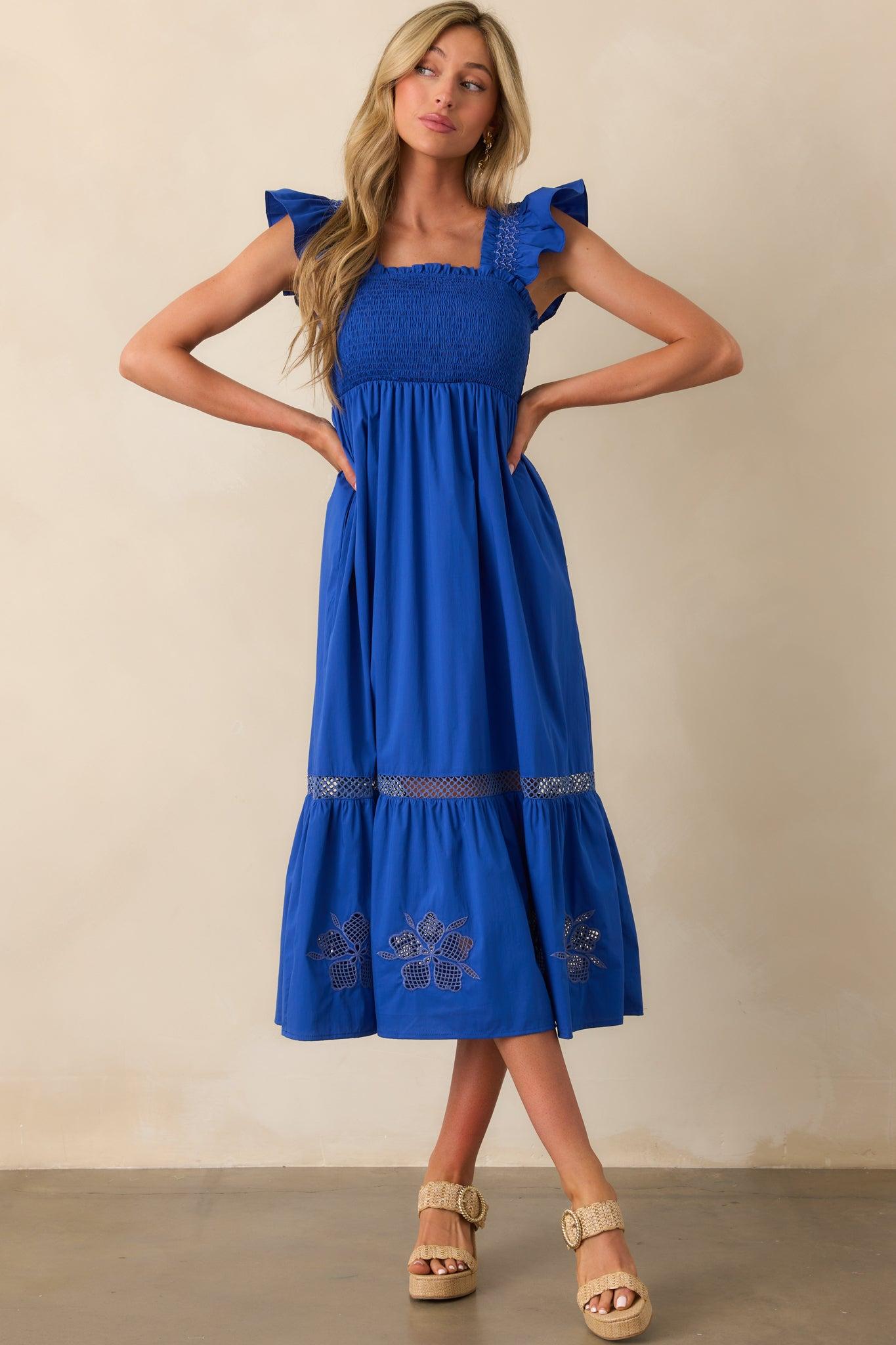 The Don't Mind If I Do Cobalt Blue Cotton Embroidered Eyelet Midi Dress exudes refined femininity and effortless charm, making it an ideal choice for feeling polished and confident on any occasion. This cobalt blue midi dress features a square neckline, fully smocked bust, flutter sleeves, ruffle trim detailing, floral embroidered eyelet embellishments along the bottom tiered skirt, and functional pockets.