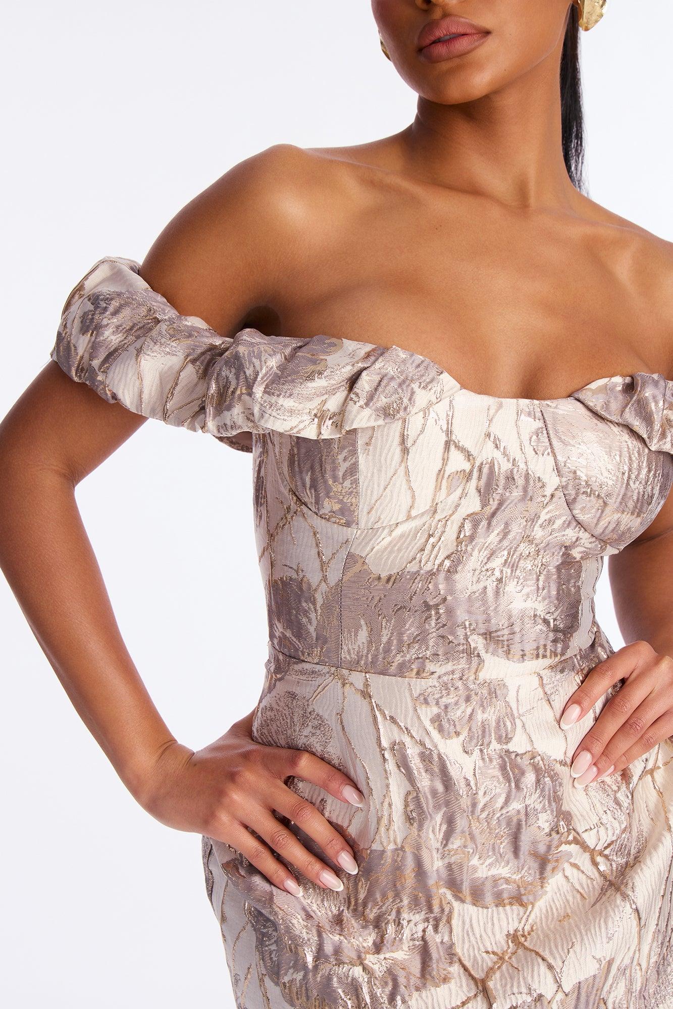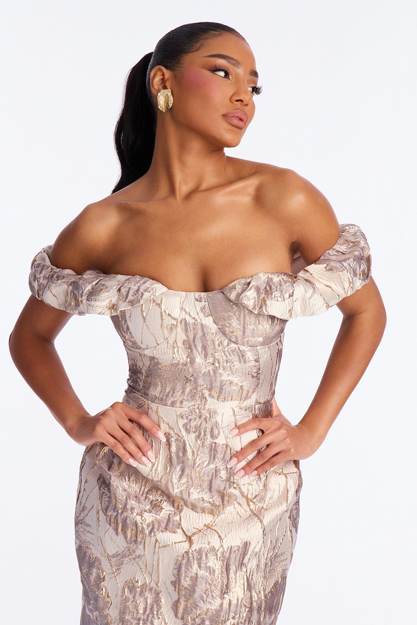 Available In Light Taupe. Midi Dress Non Stretch Lined Off Shoulder Bra Pads Back Zipper Back Slit Length Measured Flat= 43" Disclaimer: Print Placement May Vary Self: 55% Polyester 23% Metallic Yarn 22% Nylon Lining: 100% Polyester Imported