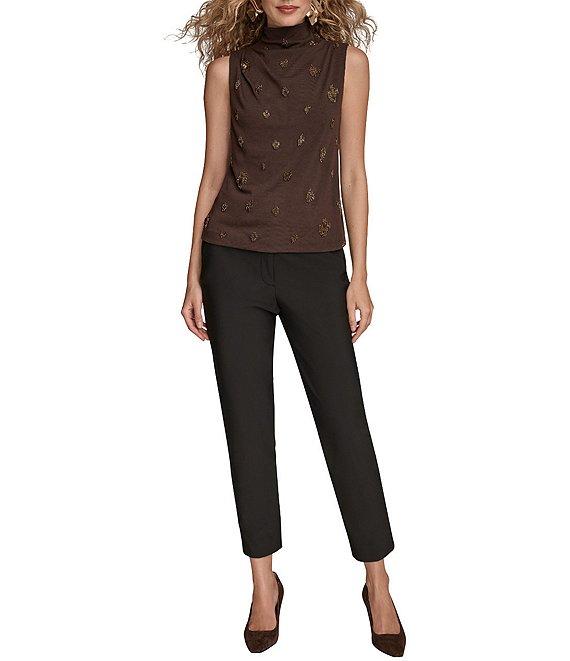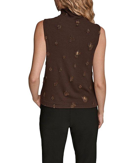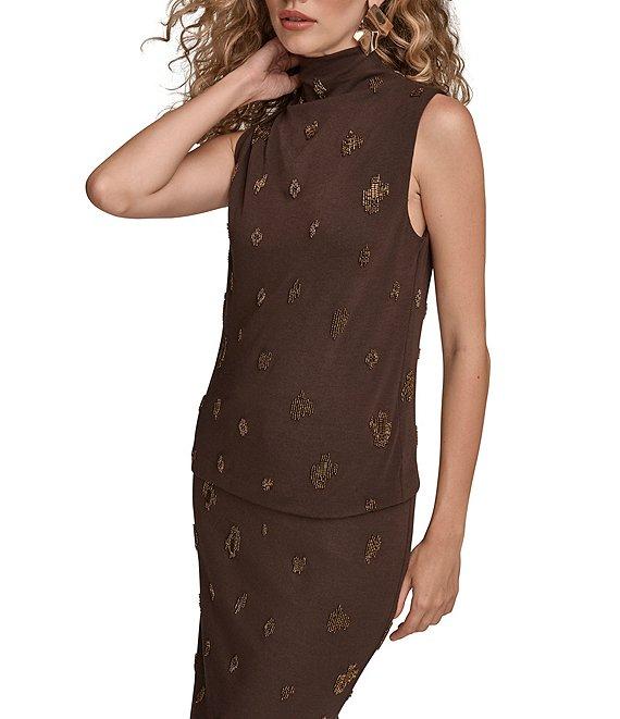 Donna Karan Beaded Mock Neck Ruched Sleeveless Top