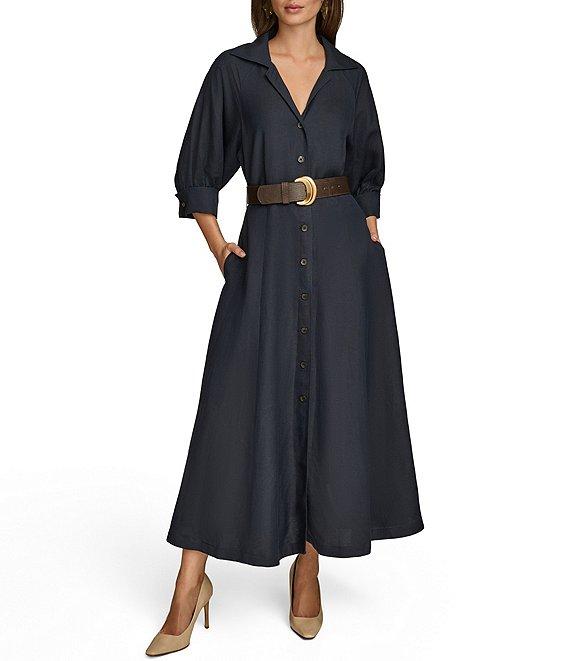 From Donna Karan, this dress features: Linen blend fabrication Collared neckline 3/4 sleeves Belted Center front button closure Approx. 49" length Linen/viscose Machine wash Imported.