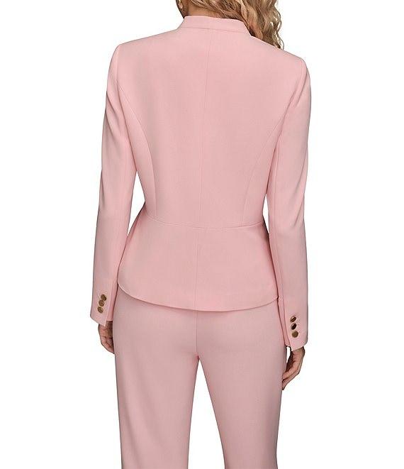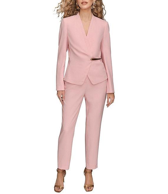 From Donna Karan, this jacket features: Crepe fabrication Wrap silhouette Surplice v-neckline Long sleeves Shoulder pads Gold hardware detail at waist Lined Hook and eye snap closure Approx. 22.5" center back length Shell: polyester/elastane spandex; lining: polyester Dry clean Imported.