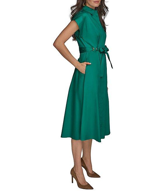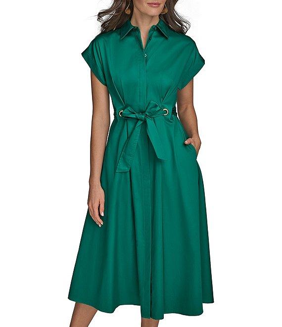 From Donna Karan, this dress features: Cotton sateen fabrication Button down collared neckline Short sleeves Shirt dress silhouette Pockets Grommet detail at waist with tie sash belt Button front closure Approx. 47.5" in length Cotton Machine wash/dry flat Imported.