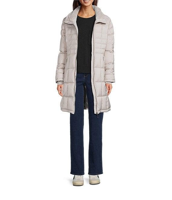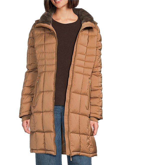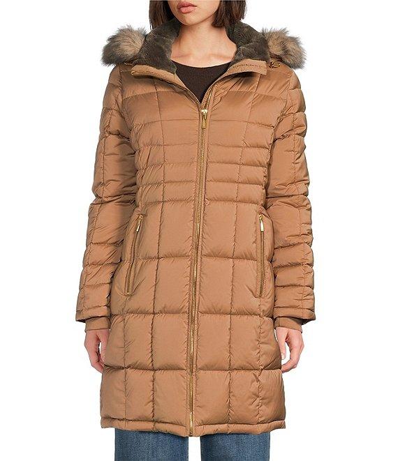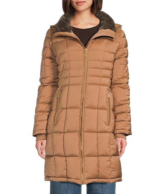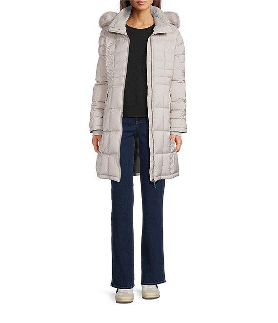 From Donna Karan, this coat features: Walker puffer silhouette Hooded neckline Long sleeves Front zip pockets Faux fur trim Water resistant Heavyweight Straight fit Fully lined Straight hemline Zip front closure Approx. 34" length Polyester; lining: polyester Machine wash Imported.