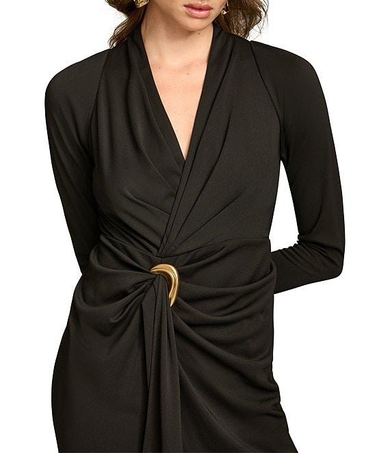 From Donna Karan, this dress features: Filament jersey fabrication V-neck Long sleeve Front bodice gather Gold hardware detail Skirt hem slit Lined Center back zipper closure Approx. 59.5" in length from high point shoulder Polyester Dry clean Imported.