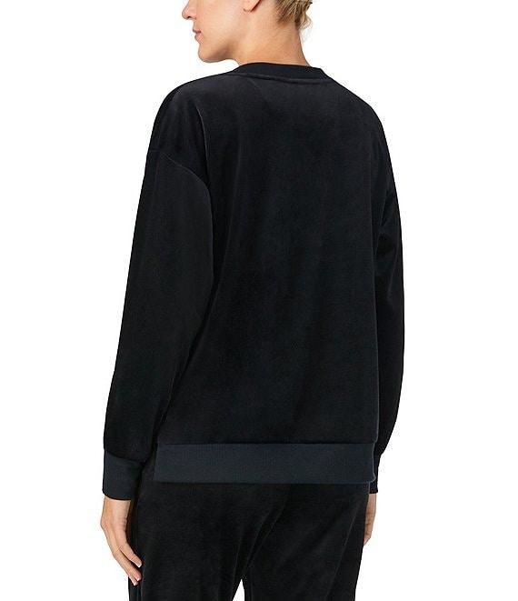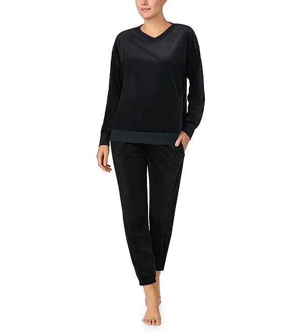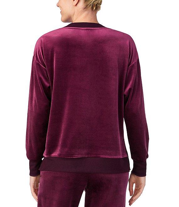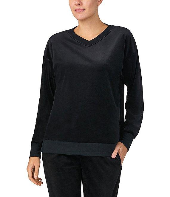 From Donna Karan, this lounge top features: Fleece fabrication V-neckline Long sleeves Ribbed trim at hem, sleeve bands and neckline Side slits Pullover construction Approx. 26" length Polyester/spandex Machine wash cold/tumble dry low Imported.
