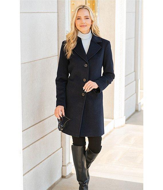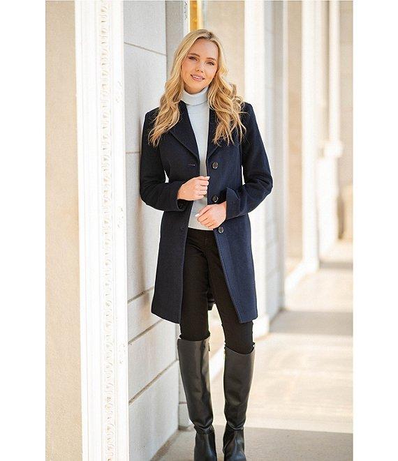 From Donna Karan, this coat features: Wool blend fabrication Single breasted silhouette Notch collar neckline Long sleeves Front pockets Straight fit Fully lined Straight hemline Button front closure Approx. 34" length Wool/polyester/cashmere; lining: polyester Dry clean Imported.