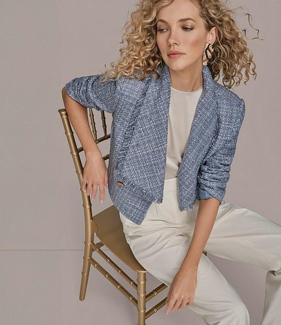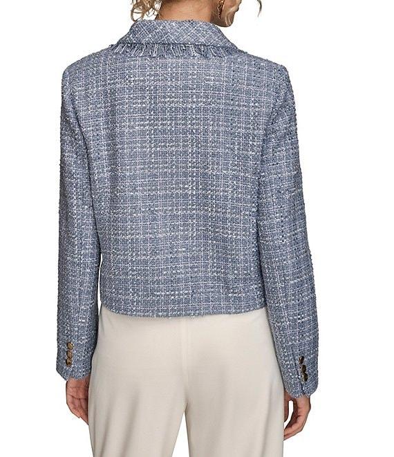 Donna Karan Ribbon Tweed Fringe Cropped Double Breasted Jacket