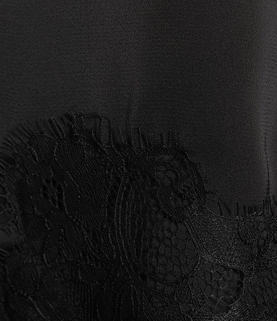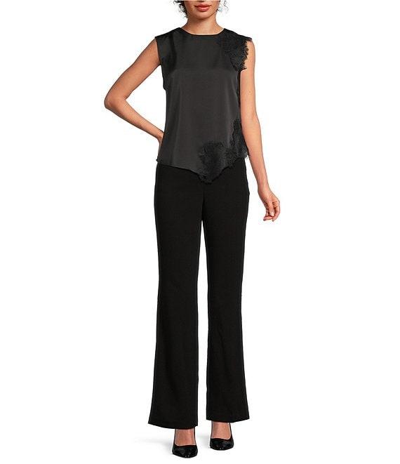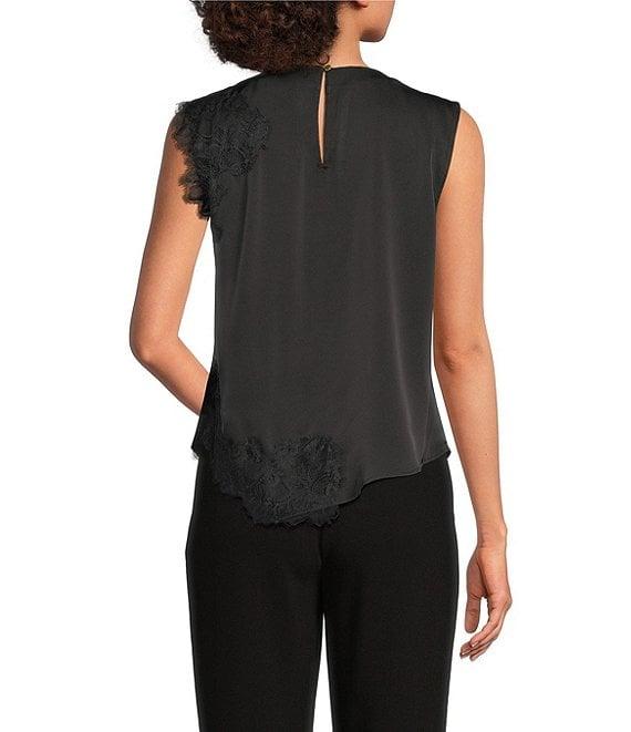 From Donna Karan, this blouse features: Satin back crepe fabrication Crew neckline Sleeveless Lace trim at shoulder and hem Asymmetric hem Center back keyhole with button closure Approx. 23.5" length Polyester Machine wash cold/dry flat Imported.