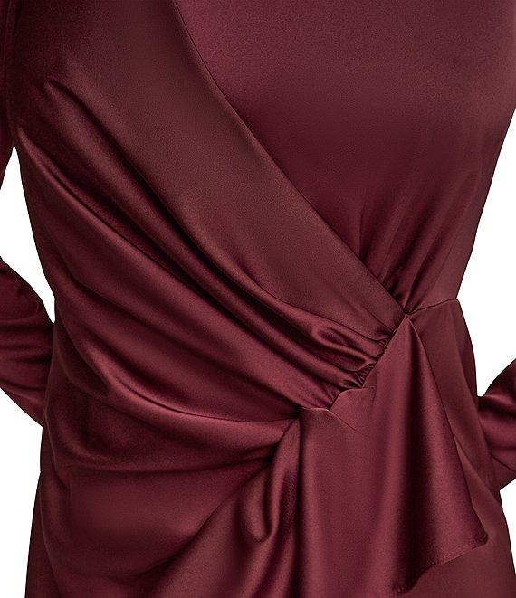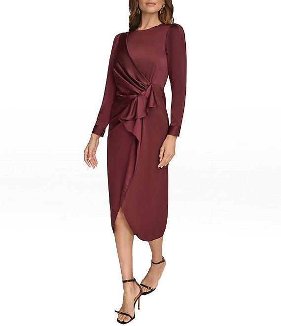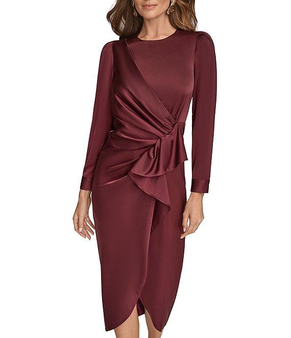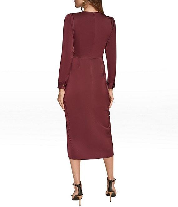 Donna Karan Satin Crew Neck Long Sleeve Faux Wrap Midi Dress