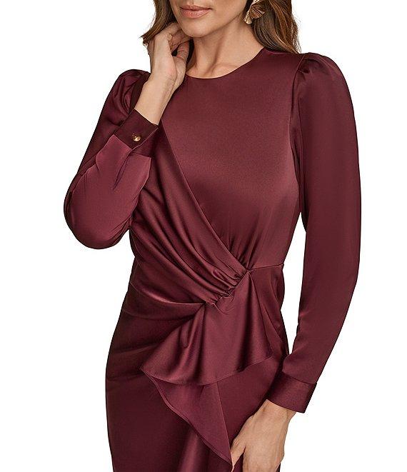 From Donna Karan, this dress features: Satin fabrication Crew neckline Long sleeve Faux wrap silhouette Gathered ruffle front bodice Lined Center back zipper closure Approx. 48.75" in length Polyester/spandex Dry clean Imported.