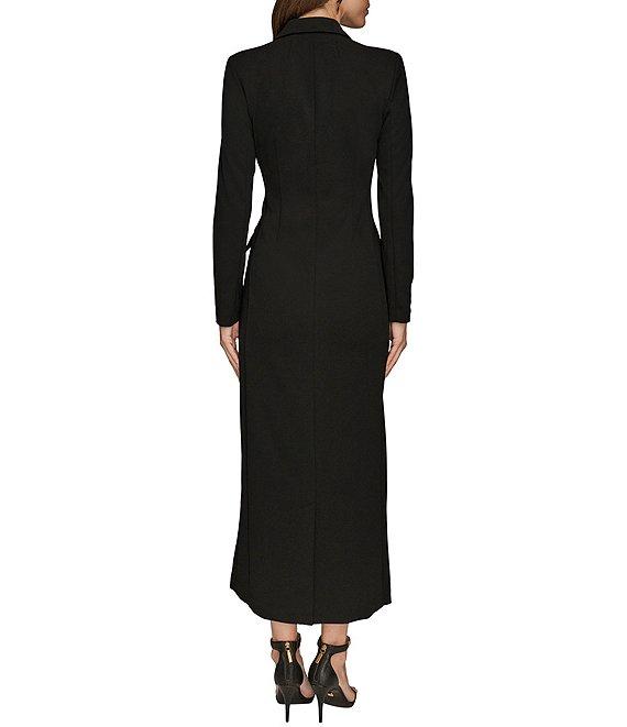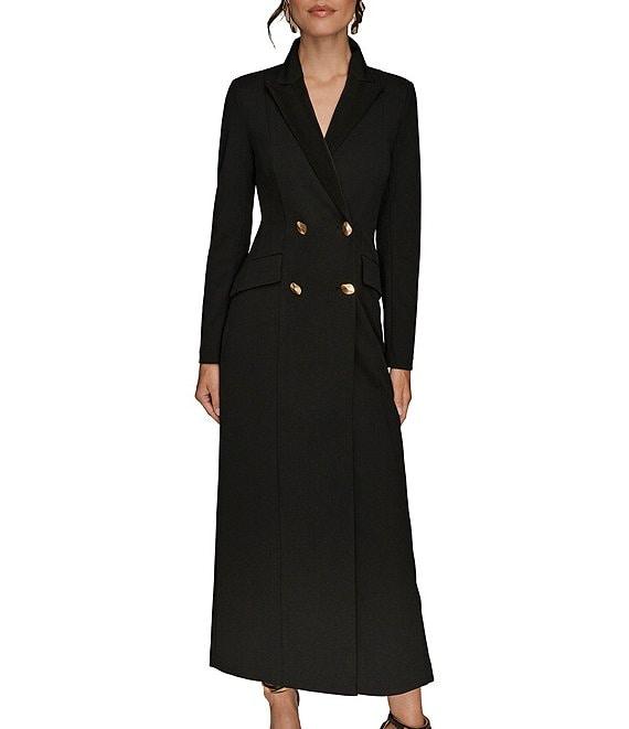 From Donna Karan, this dress features: Scuba crepe twill and satin fabrication Wrap v-neckline Long sleeves Notched collar detail Front pocket detail Front hem slit opening Lined Button front placket closure Approx. 53.75" in length Polyester/spandex Dry clean Imported.