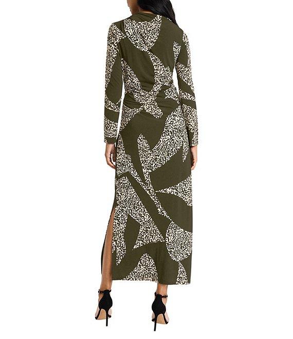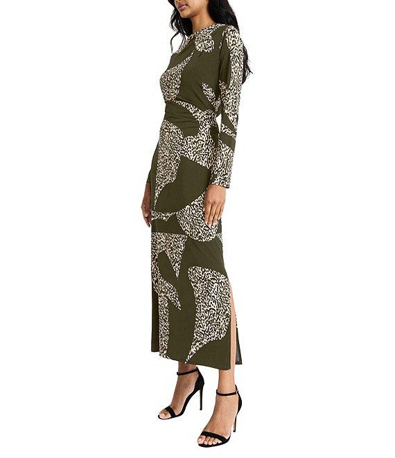 Donna Morgan Spotted Print Matte Jersey Sheath Boat Neck Long Sleeve Side Slit Maxi Dress