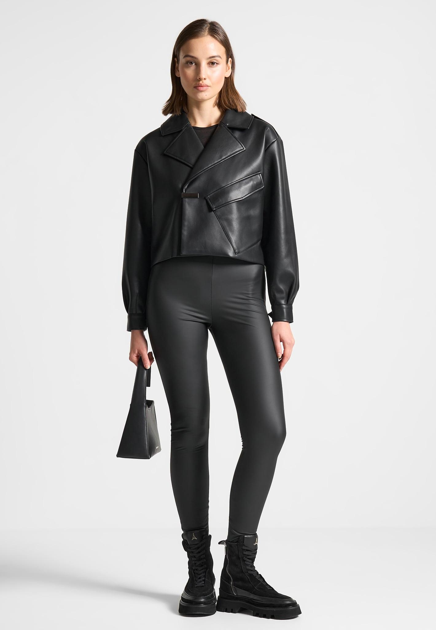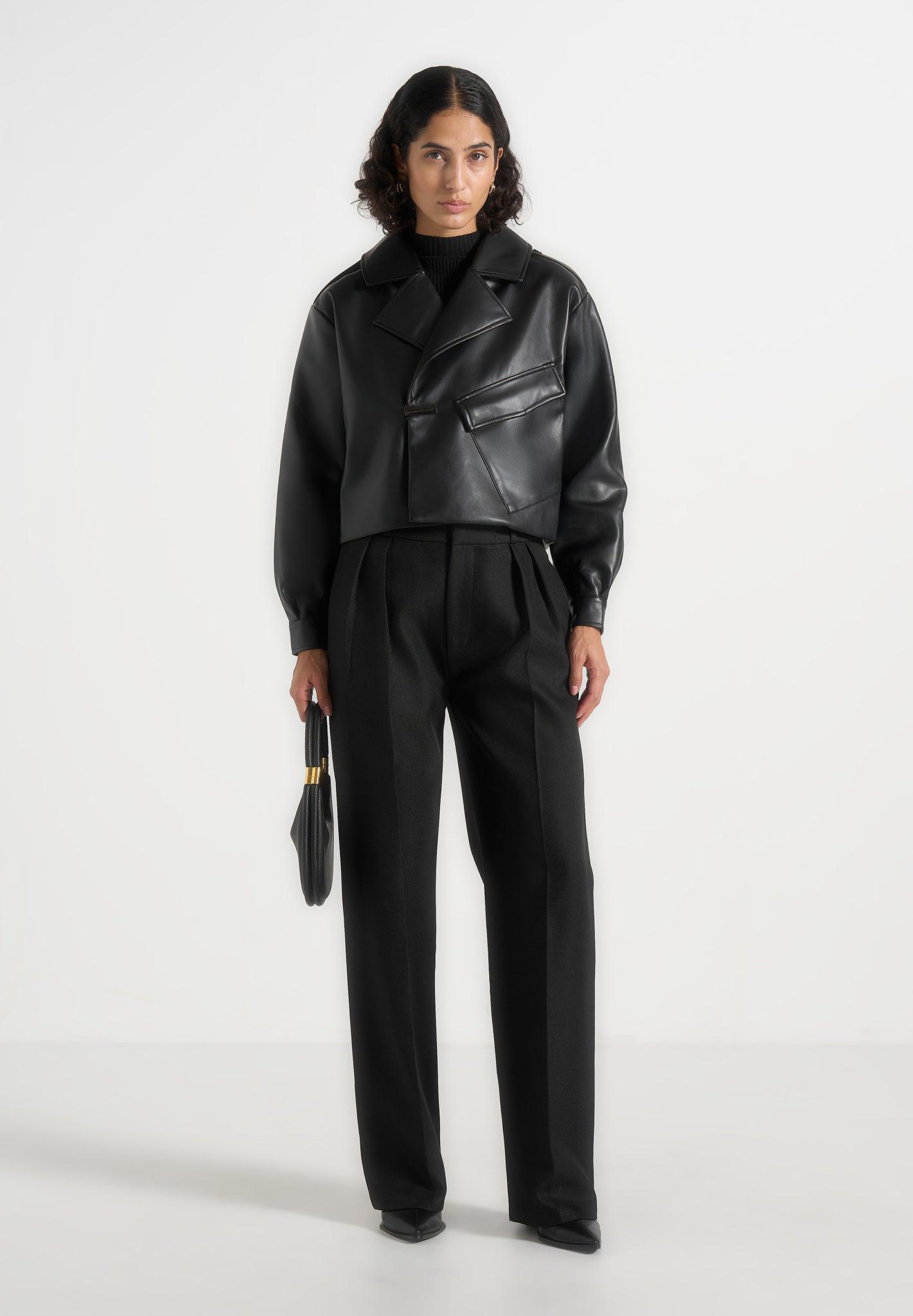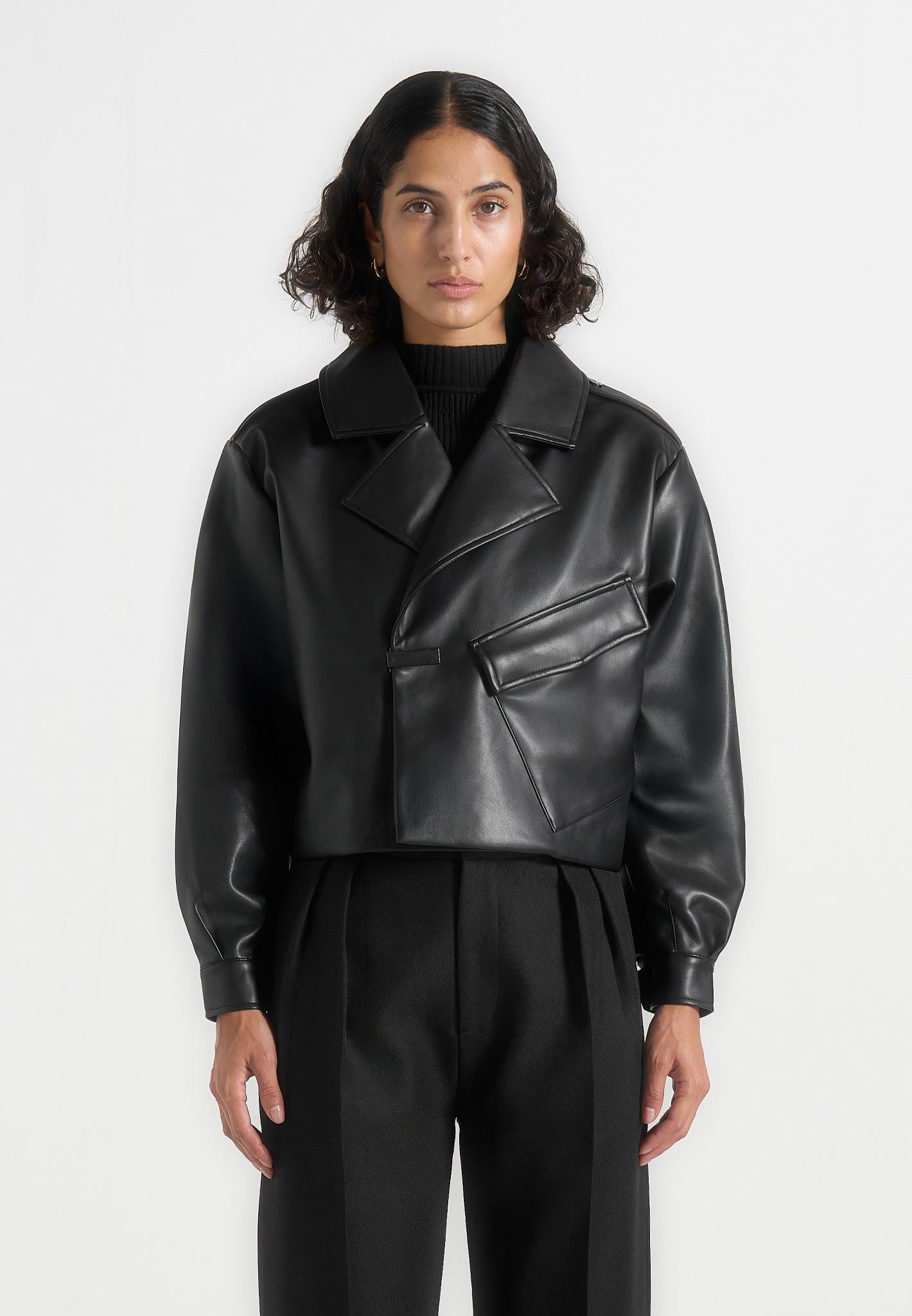 This Double Breasted Vegan Leather Biker Jacket is crafted from premium vegan leather fabric for a unique take on a classic design. It is sure to stand out with its edgy vibe. Double Breasted Jacket Silhouette Internal Button and Front Clasp Closure Lapel Collar Wide Sleeve Feature Front Chest Pocket Shoulder Epaulets Gunmetal Manière De Voir Eiffel Plaque 45% PU, 55% Polyester / 95% Polyester, 5% ElastaneAlways check the care label for wash instructions.