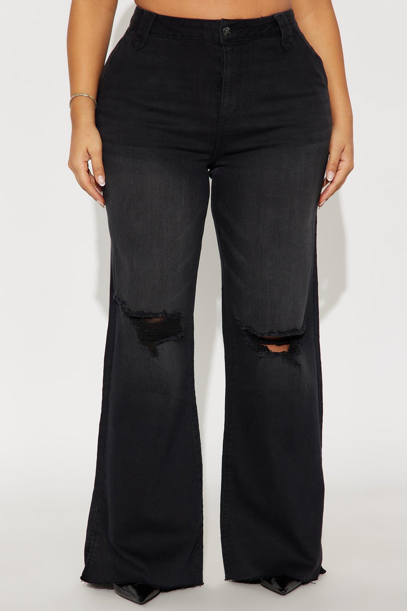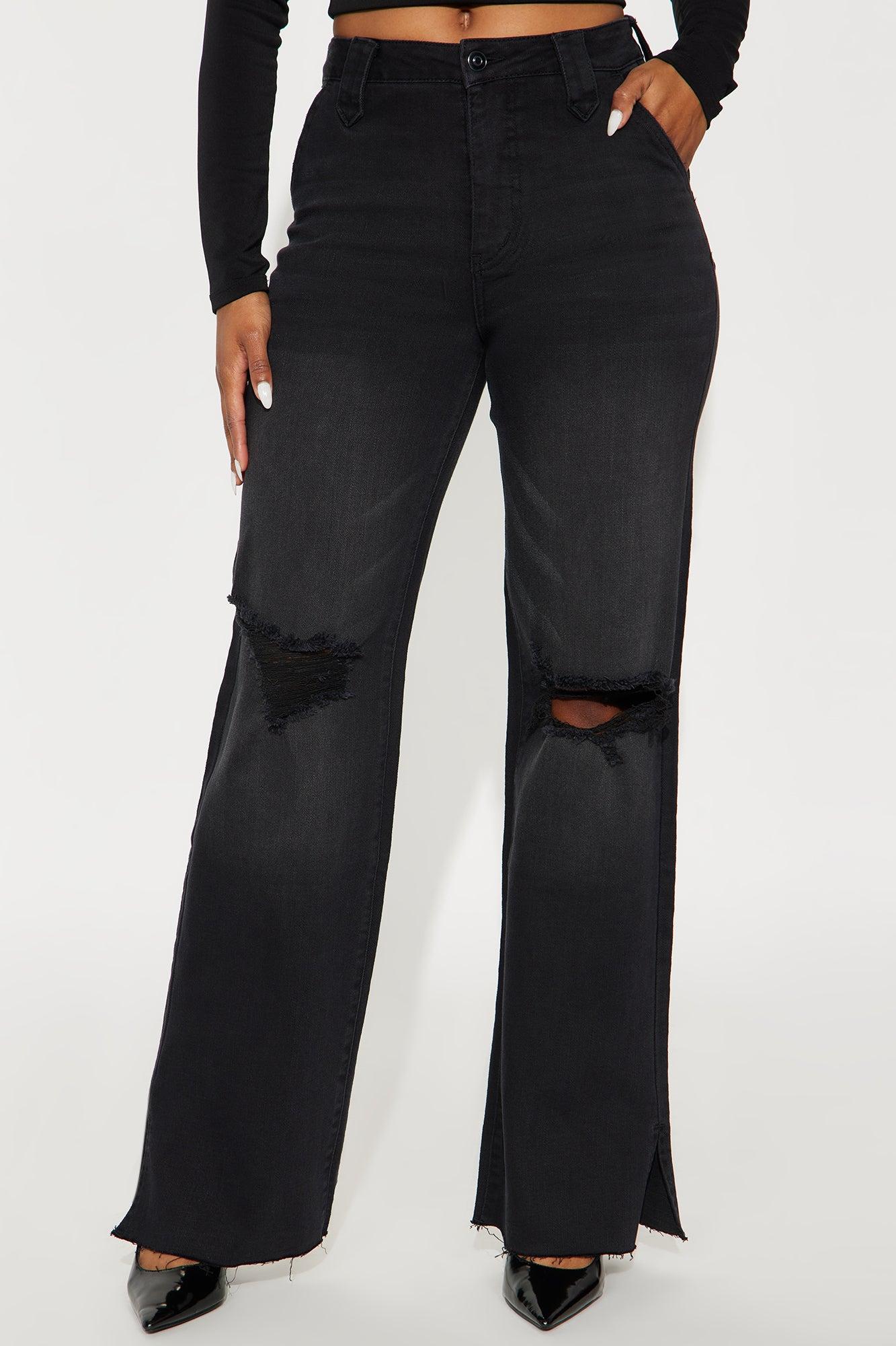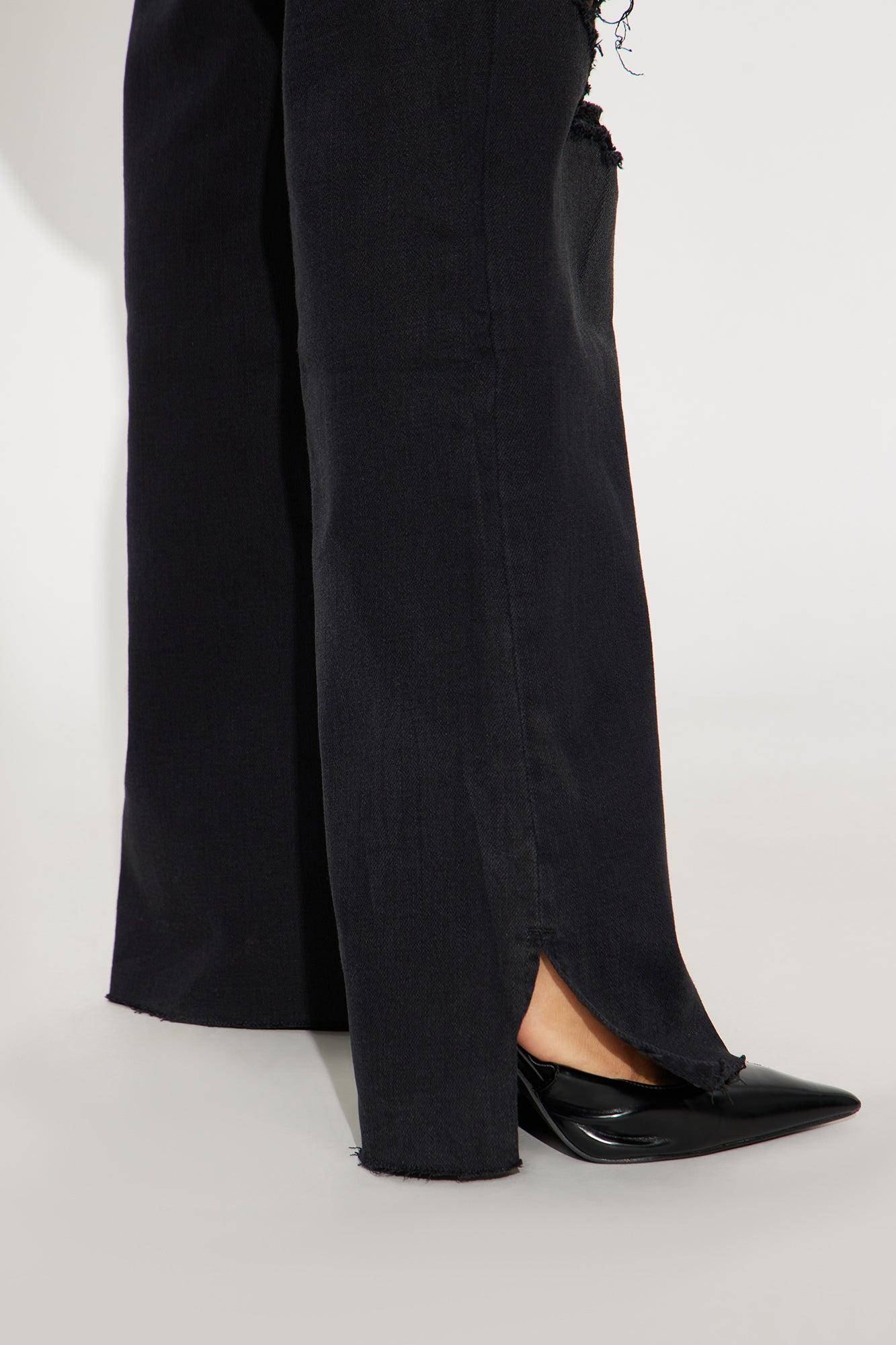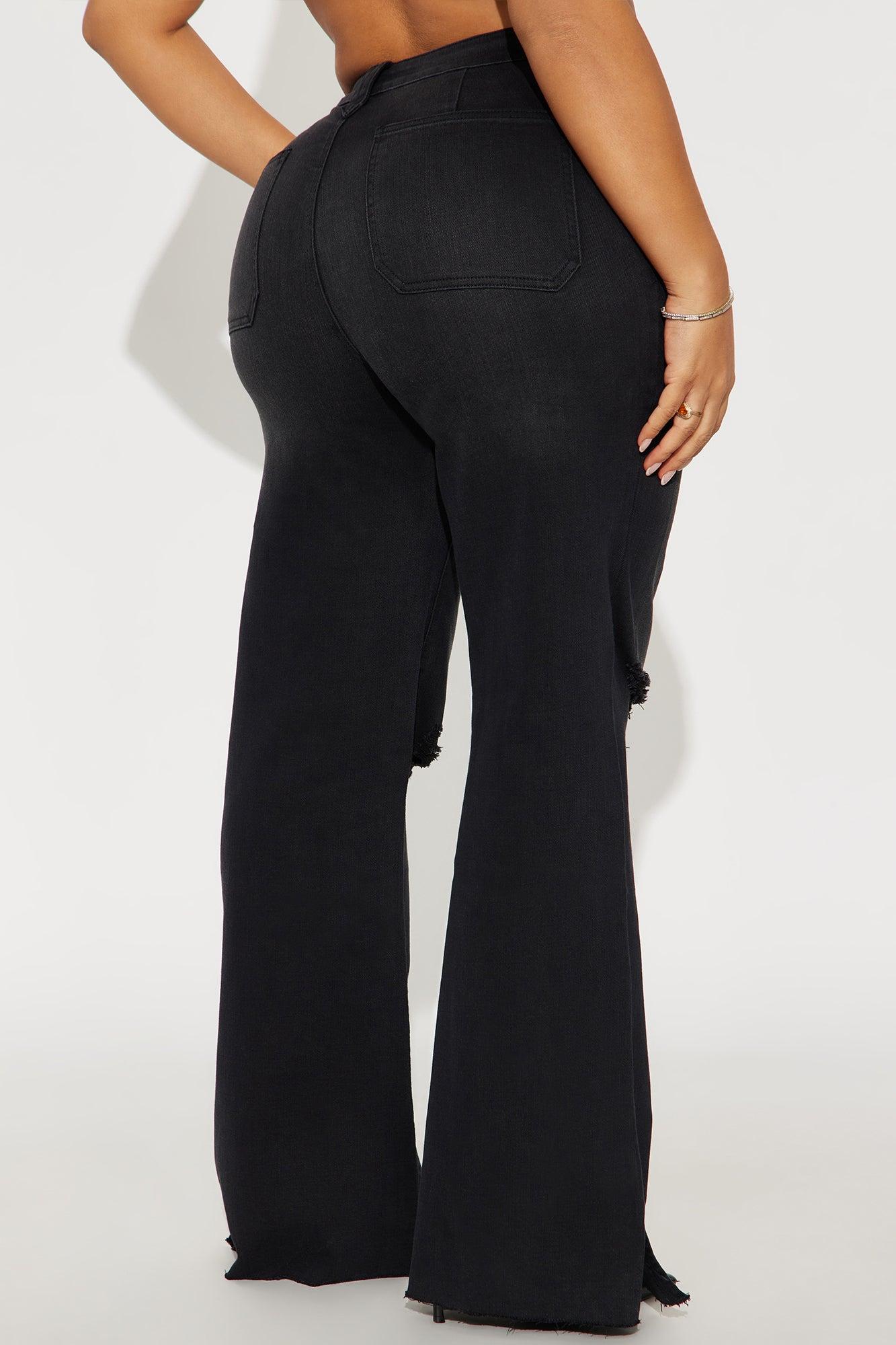 Available In Black Wash. Flare Jean Trouser Pockets Ripped Fray Hem Split Hem Darts 11" High Rise 33" Inseam High Stretch Disclaimer: Due to the specialized wash process, each garment is unique. 65% Cotton 31% Polyester 3% Rayon 1% Spandex Imported California Proposition 65WARNING: Cancer and Reproductive Harm - www.P65Warnings.ca.gov.