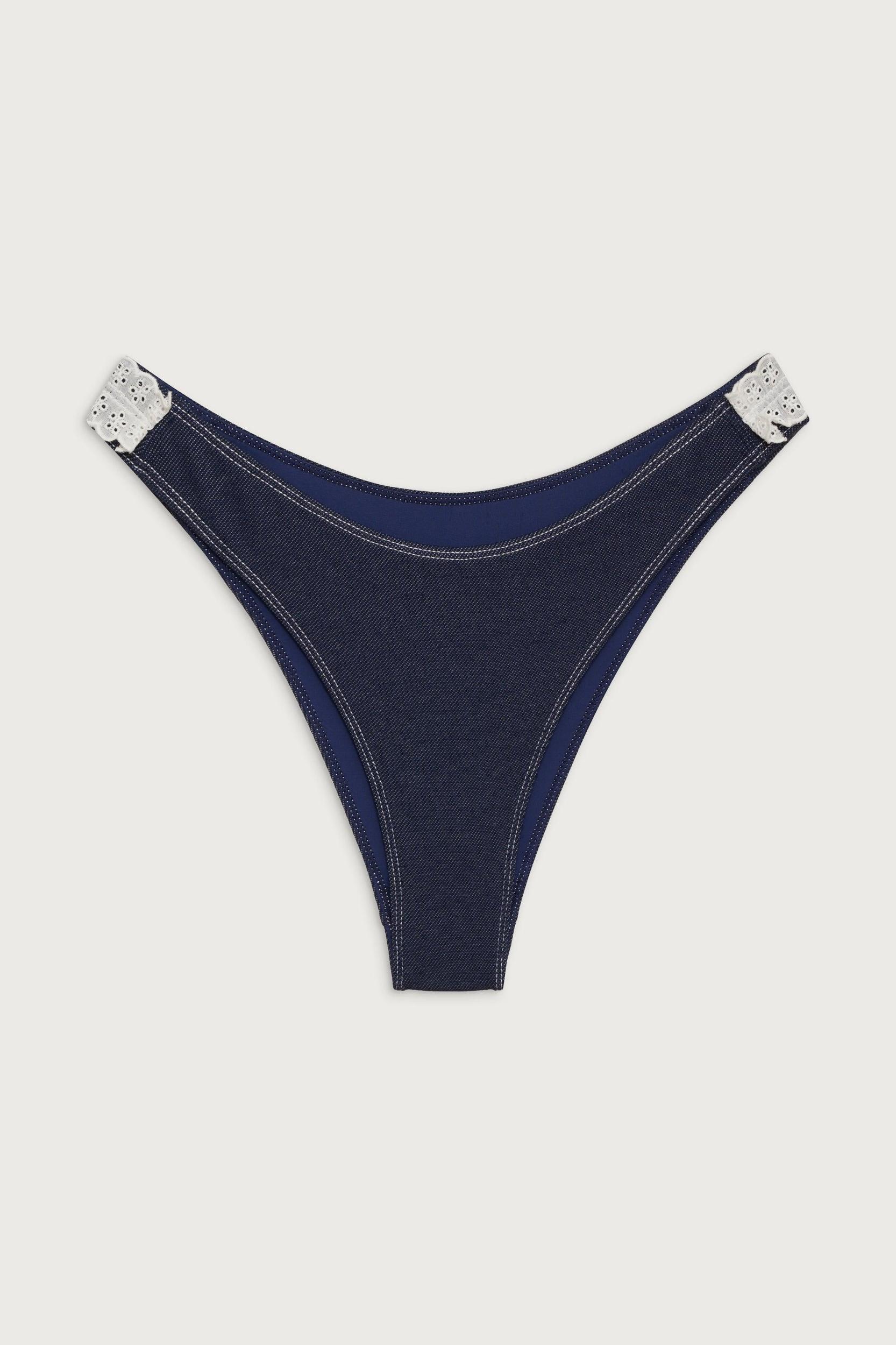 A timeless bikini bottom designed with classic coverage. Meet Dove, a high leg silhouette crafted in a soft denim-inspired swim fabric. Pair the Dove bikini bottom with the matching Ford bikini top as your most flattering set. Fabric 75% Rayon + 20% Polyester + 5% Spandex Classic Coverage Model Size & Fit This style runs true to size Laura is wearing a size Small Height 5'10.5" (179cm) Bust 33” (84cm), Waist 24” (60.96cm), Hips 35.5" (90cm)