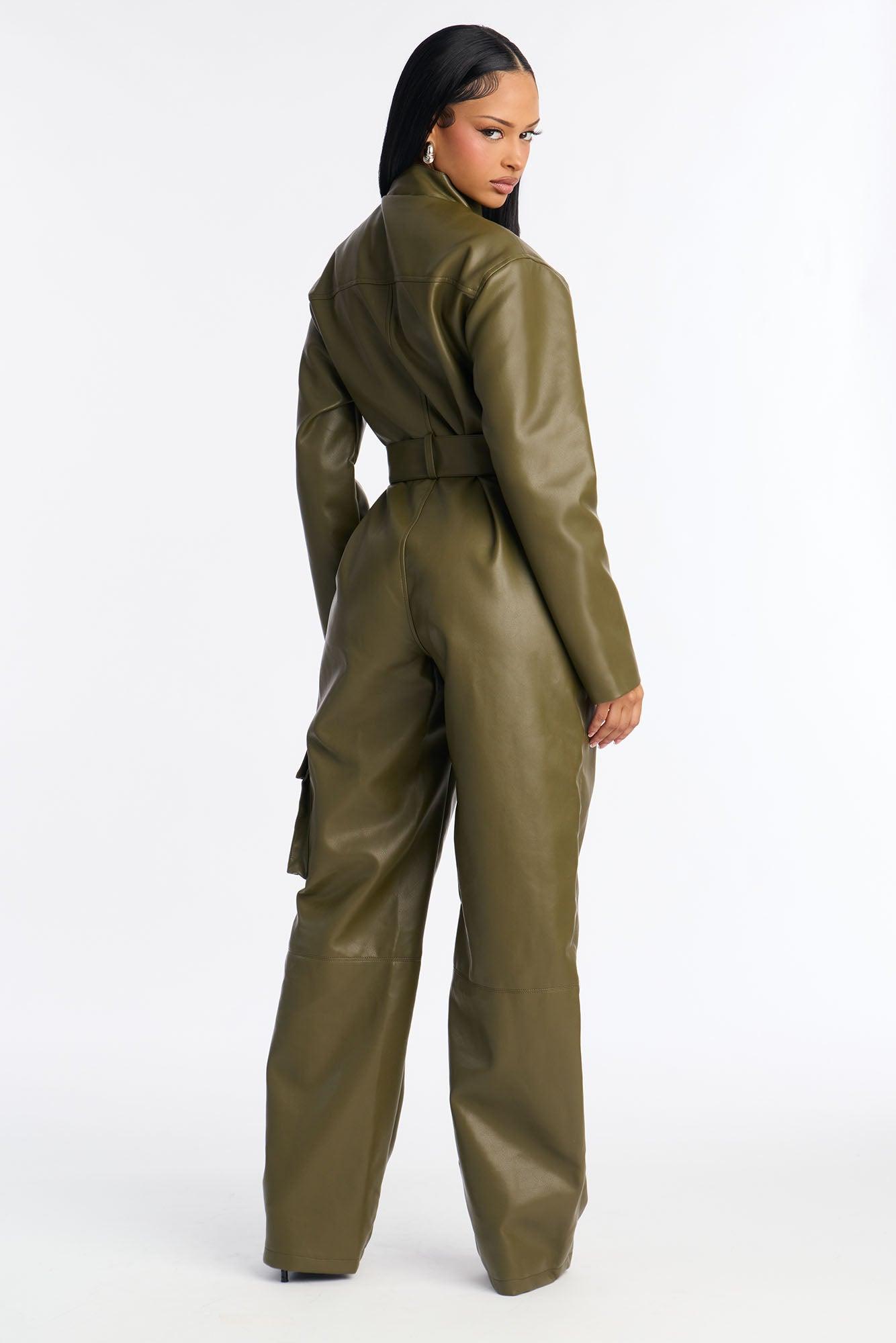 Downtown Faux Leather Cargo Straight Leg Jumpsuit - Olive Female