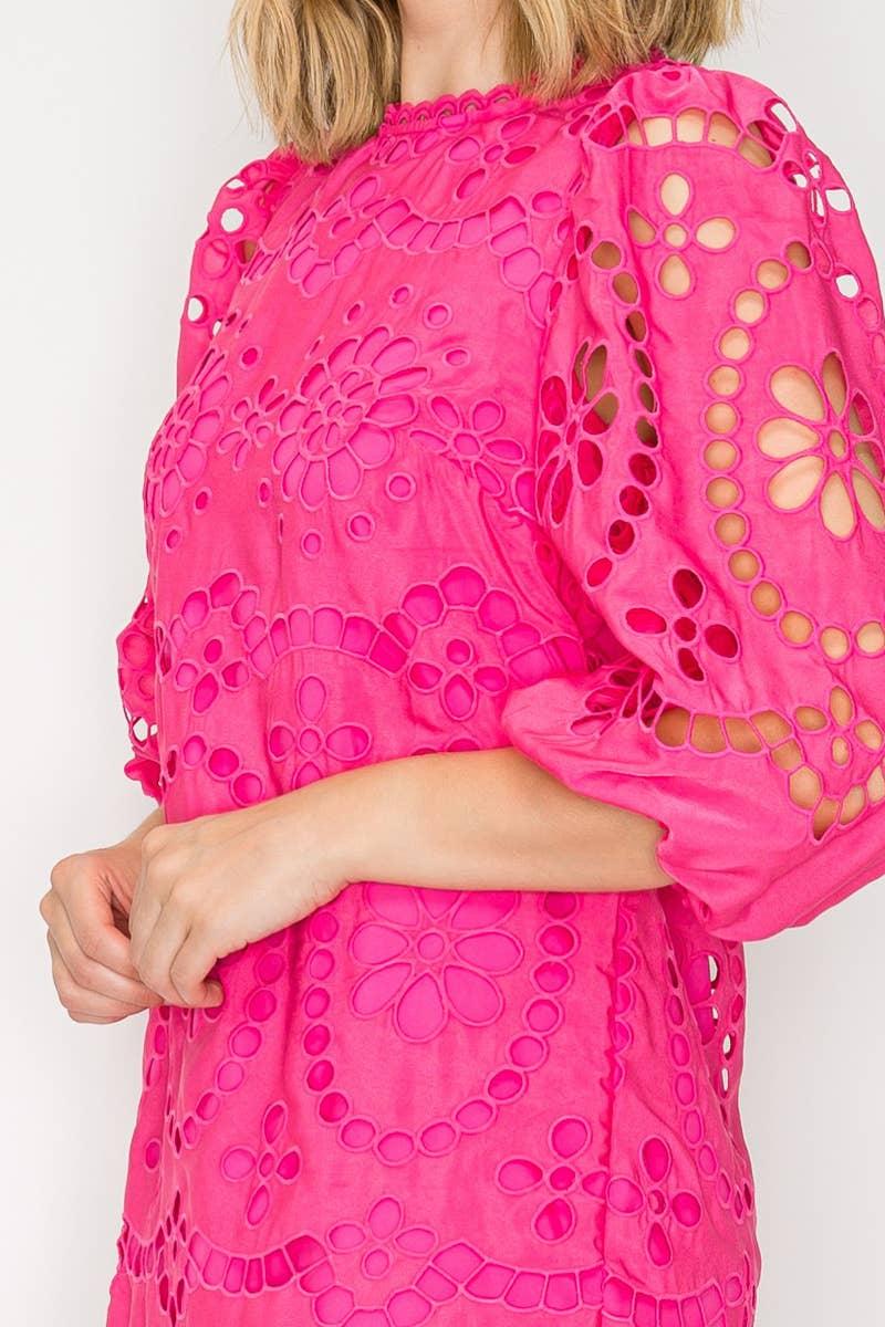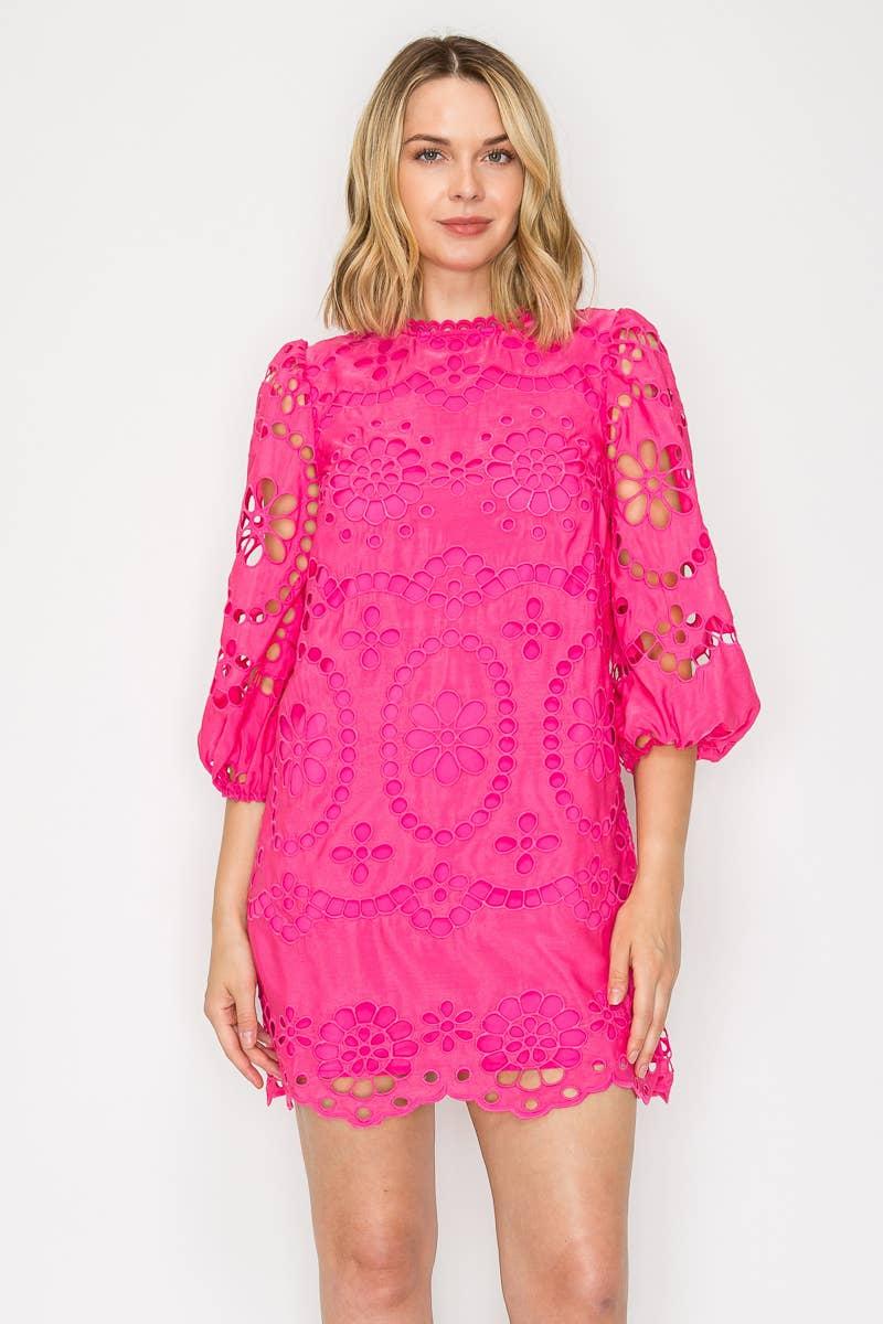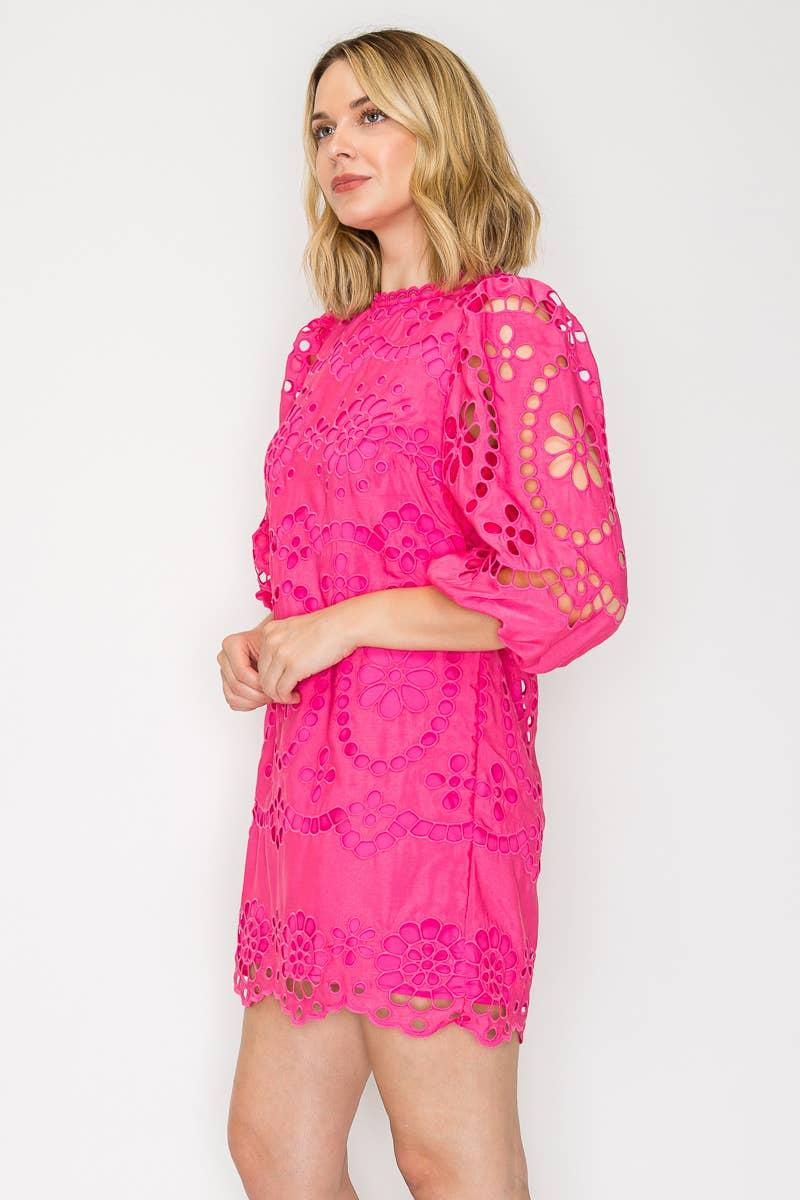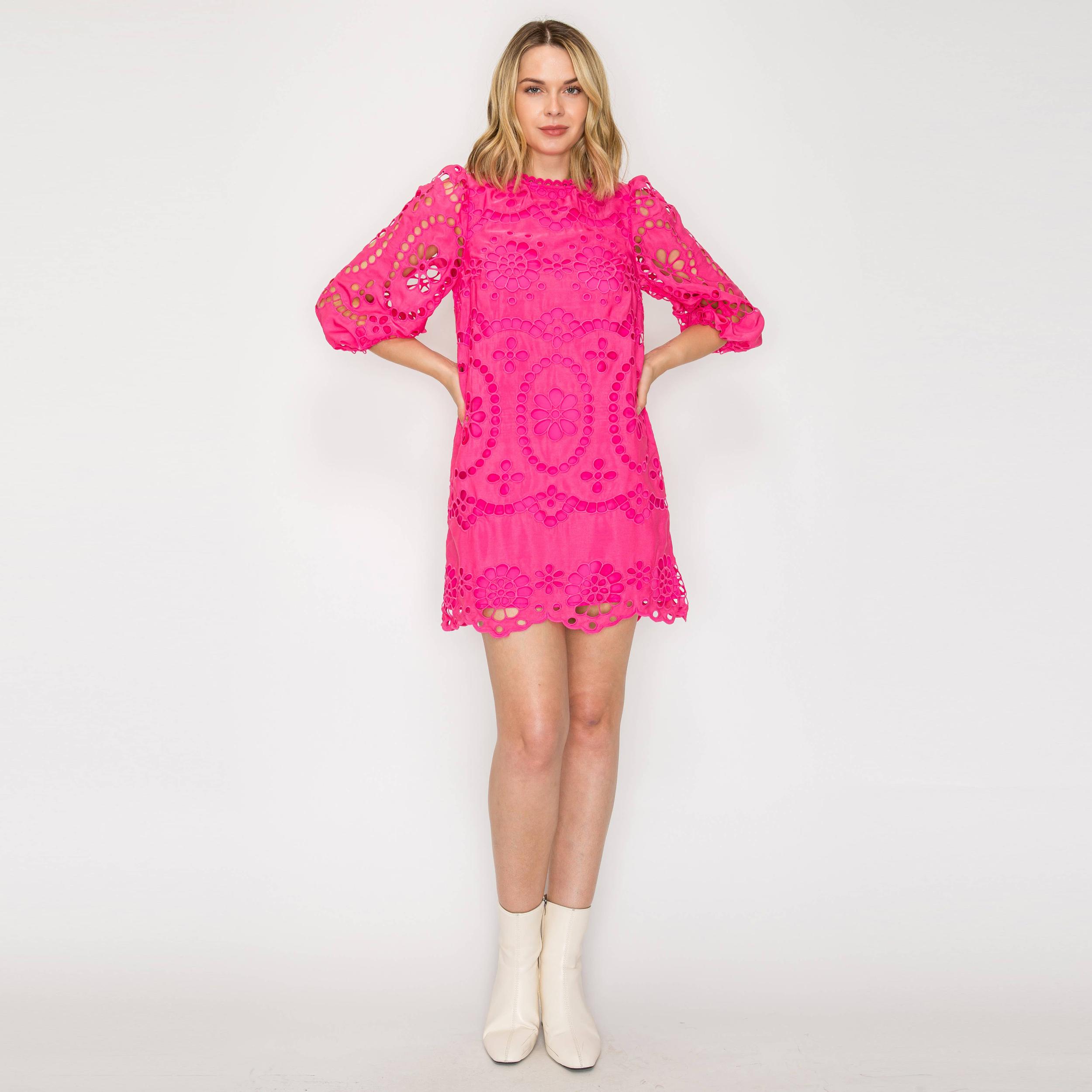 This playful mini dress features a charming daisy eyelet pattern with delicate lace trim along the neckline. It has 3/4 sleeves finished with elastic cuffs and a cute back keyhole secured by a button. Fully lined for comfort, this dress combines 100% cotton with polyester lining for a light, breezy feel. Perfect for sunny days and fun outings!