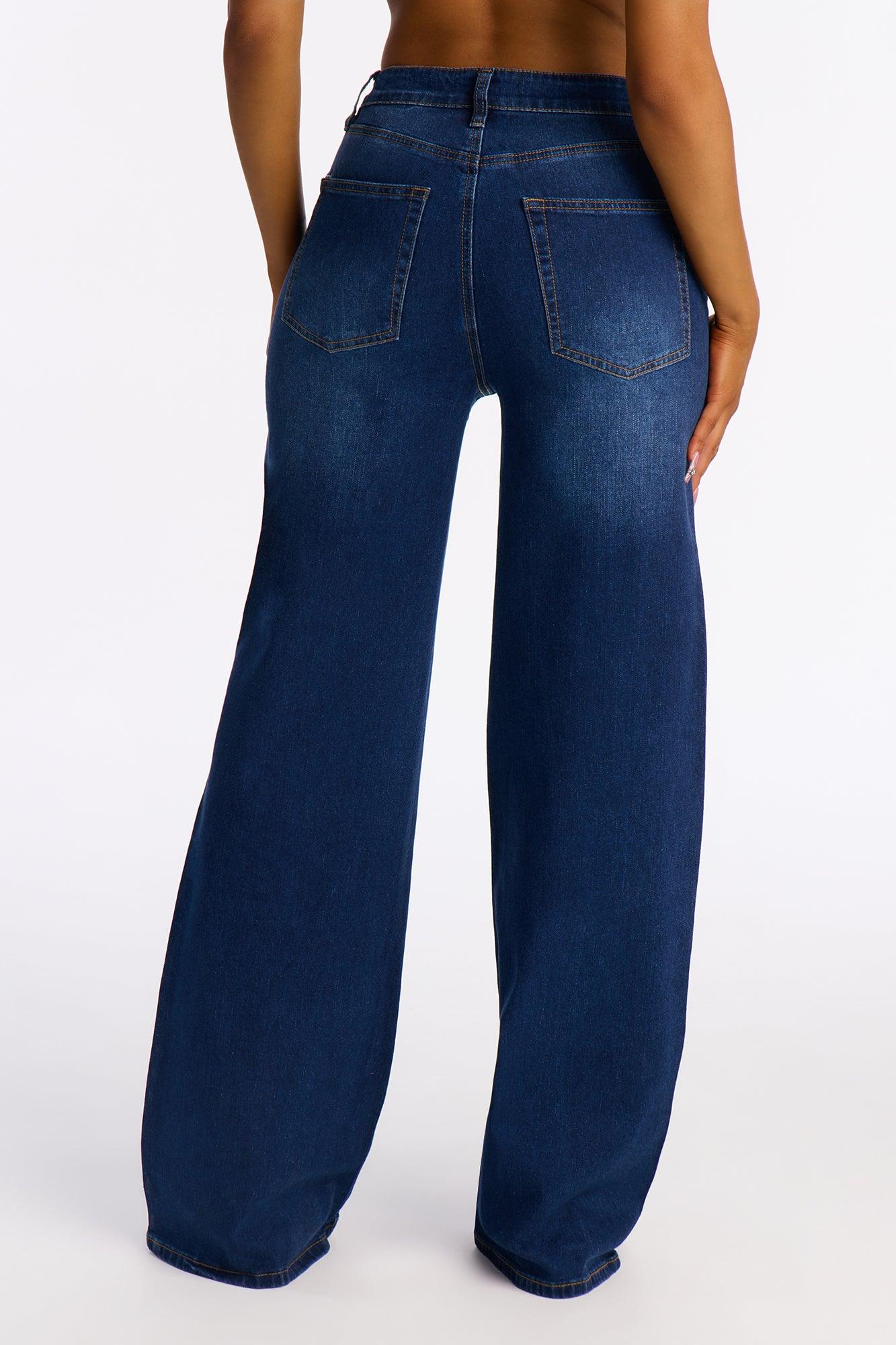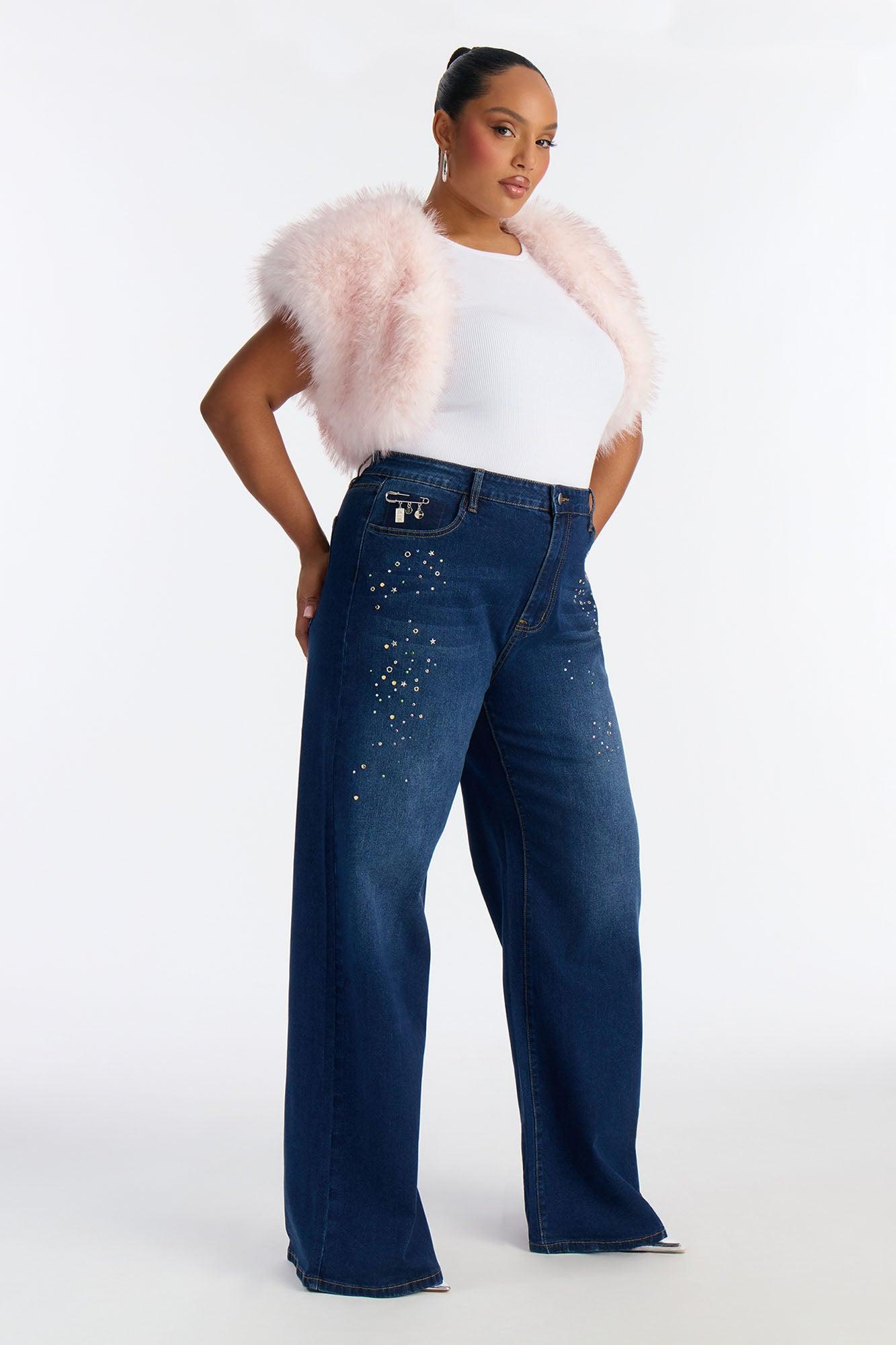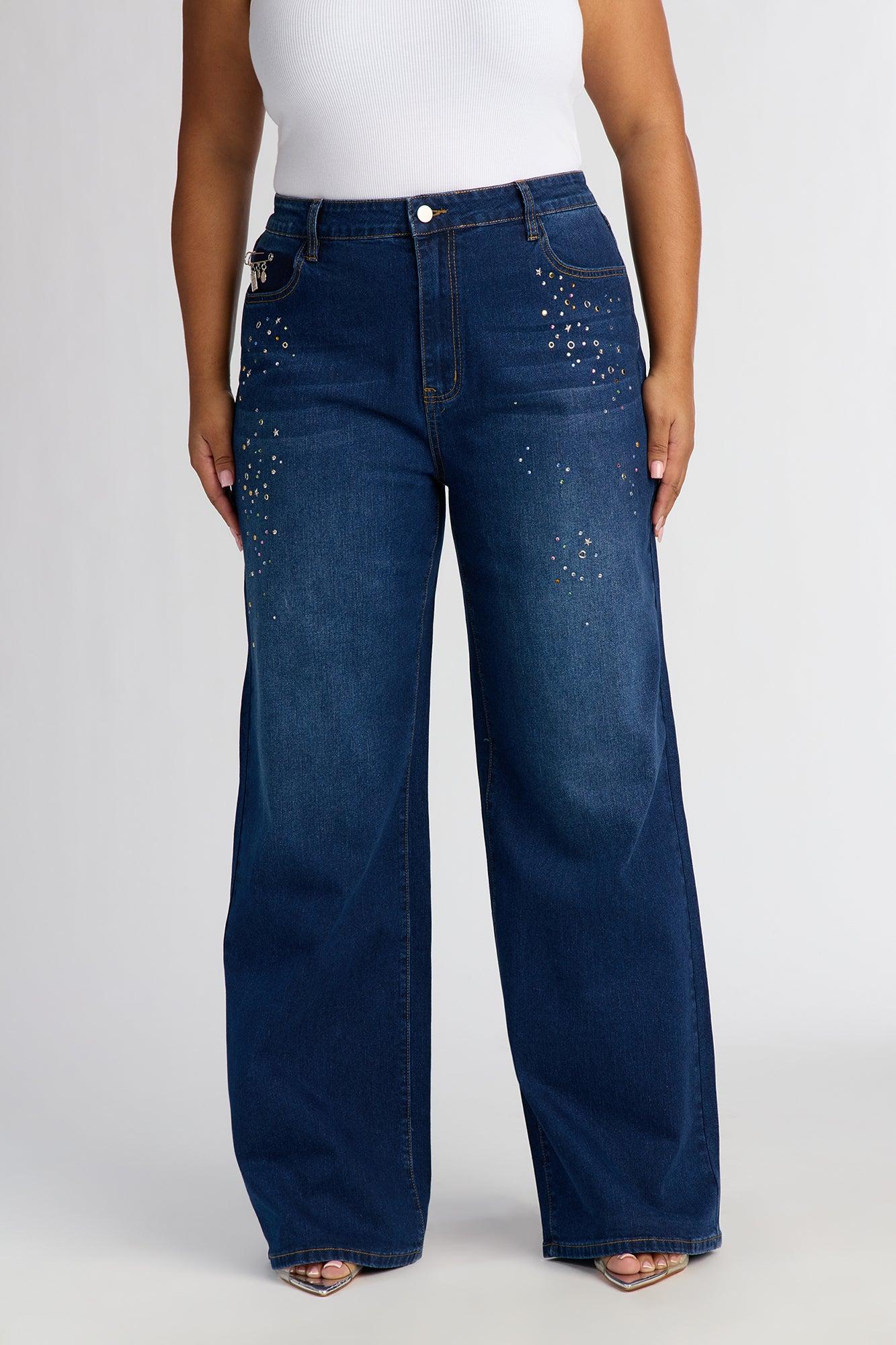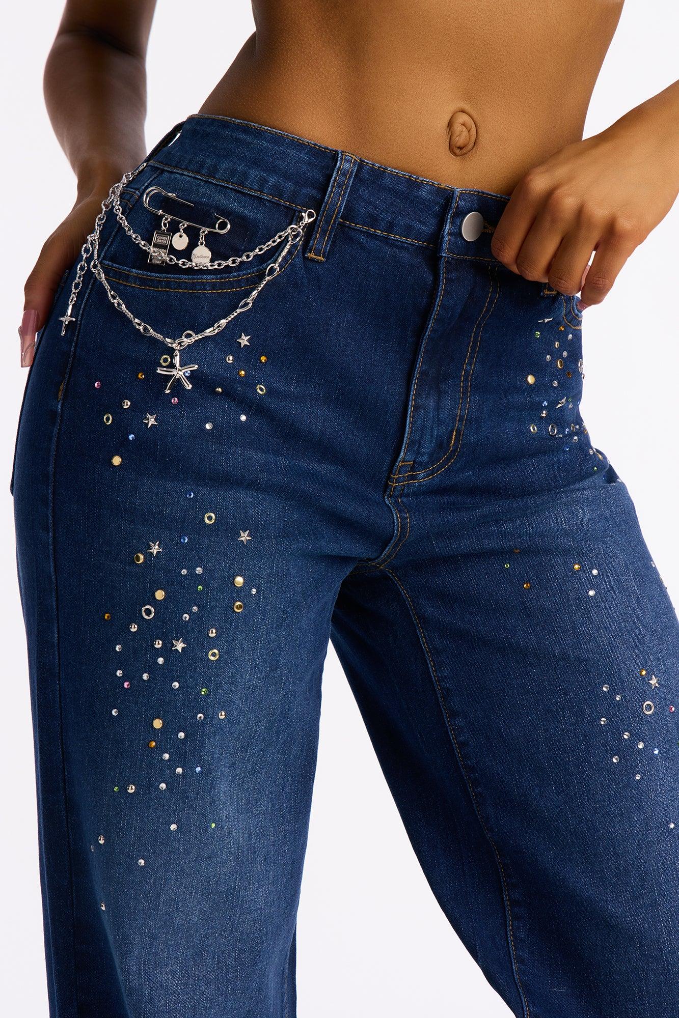 Available In Dark Wash. Straight Leg Jean 4 Pocket Tinted Embellished Removable Pin 11" Rise 33" Inseam Medium Stretch Disclaimer: Due the To The Specialized Dye Process, Loose Dye Can Stain On Contact. Do Not Wash with Other Garments Disclaimer: Rhinestone Placement Will Vary. Self: 85% Cotton 13% Polyester 2% Spandex Imported