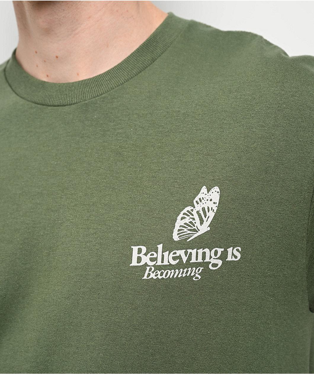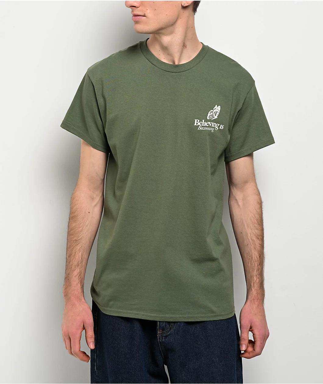 A reminder that change is constant, the In Tune t-shirt from Dravus lands in an earthy green cotton build with printed scientific graphics on the left chest and back. Boasting the faithful text "Believing is becoming" beneath a butterfly on the left