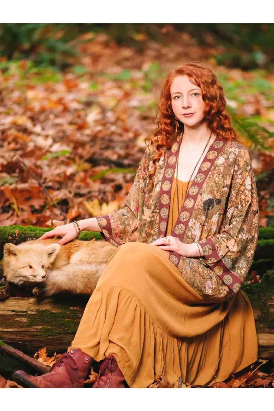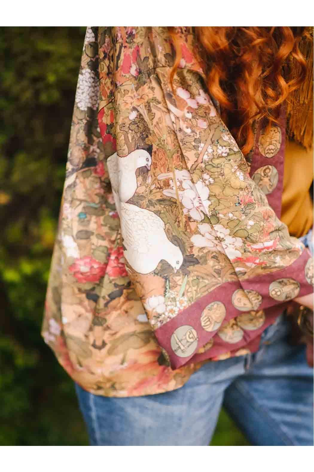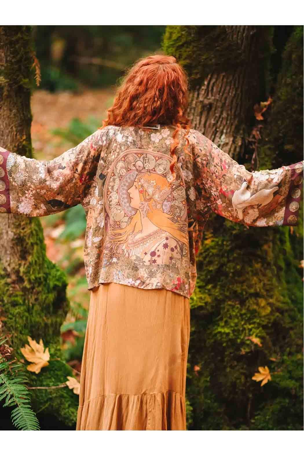 Mucha’s beloved work features a majestic woman surrounded by the by the 12 zodiac signs and adorned in intricate celestial jewellery. We added a large star to her remarkable crown. The background comes from an incredible ink-on-silk scroll painting by Ueno Setsugaku, created in the 1860’s. We trimmed this design with Mucha’s zodiac signs on a deep burgundy background. The result is an opulent and elegant take on Mucha’s work, with a nod to the luxe bohemianism of the 1970’s.