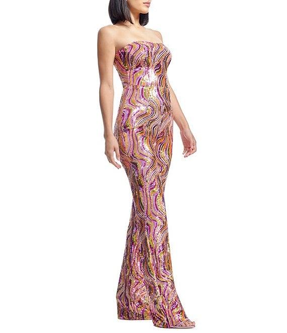 From Dress The Population, this jumpsuit features: Sequin fabrication Swirl print Strapless neckline Sleeveless Lined Back zipper closure Approx. 32.5" length Polyester/spandex Hand wash Imported.