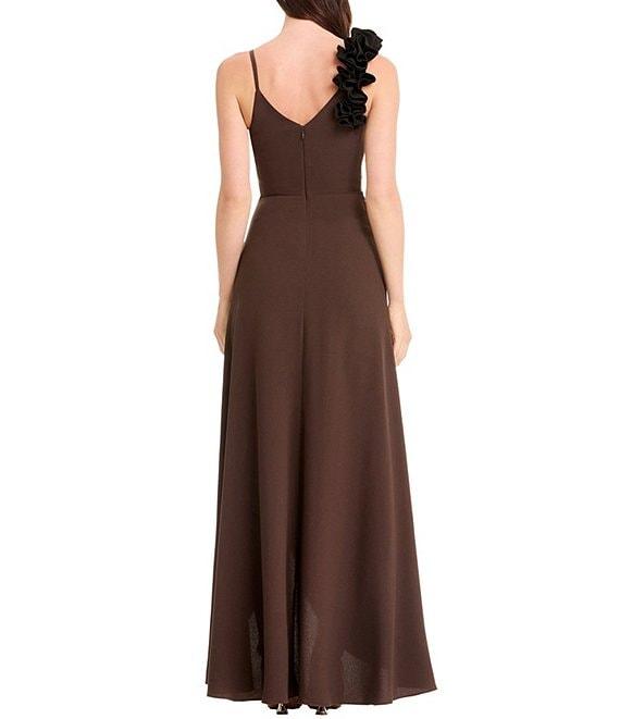 From Dress the Population, this dress features: Crepe fabrication A Line silhouette V-neckline Sleeveless Spaghetti dress Side rouching Side tight slit Zip back closure Approx. 61" length Polyester/spandex Machine wash cold Imported.