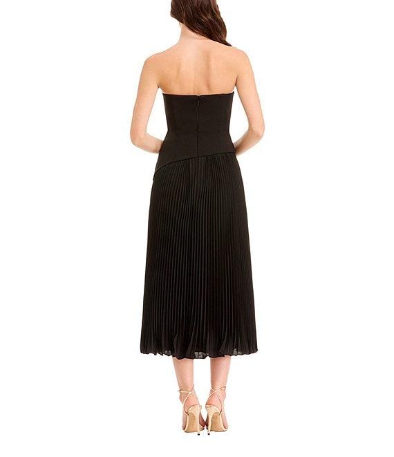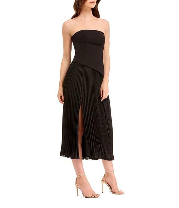 Dress the Population Kacey Strapless Asymmetrical Bodice Pleated Skirt Front Slit Midi Dress