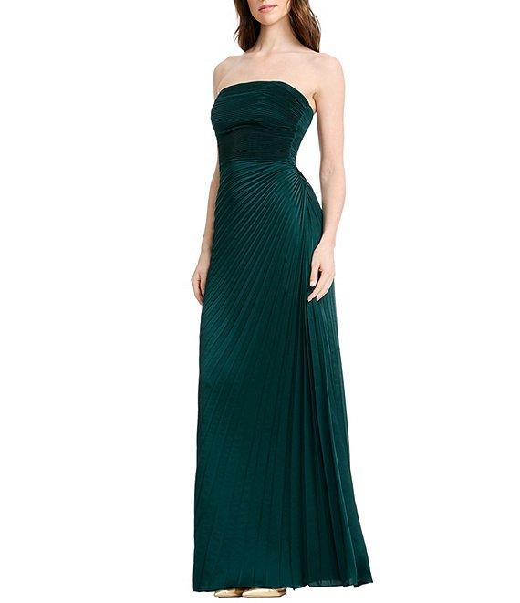 From Dress the Population, this dress features: Satin crepe fabrication A line silhouette Strapless neckline Sleeveless Pleated Zip back closure Approx. 54.25" length Polyester Dry clean Imported.