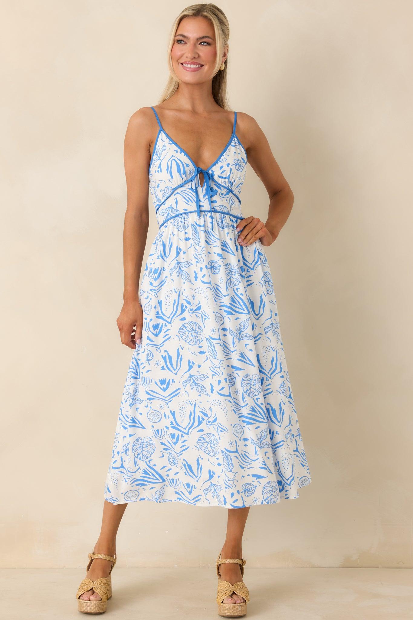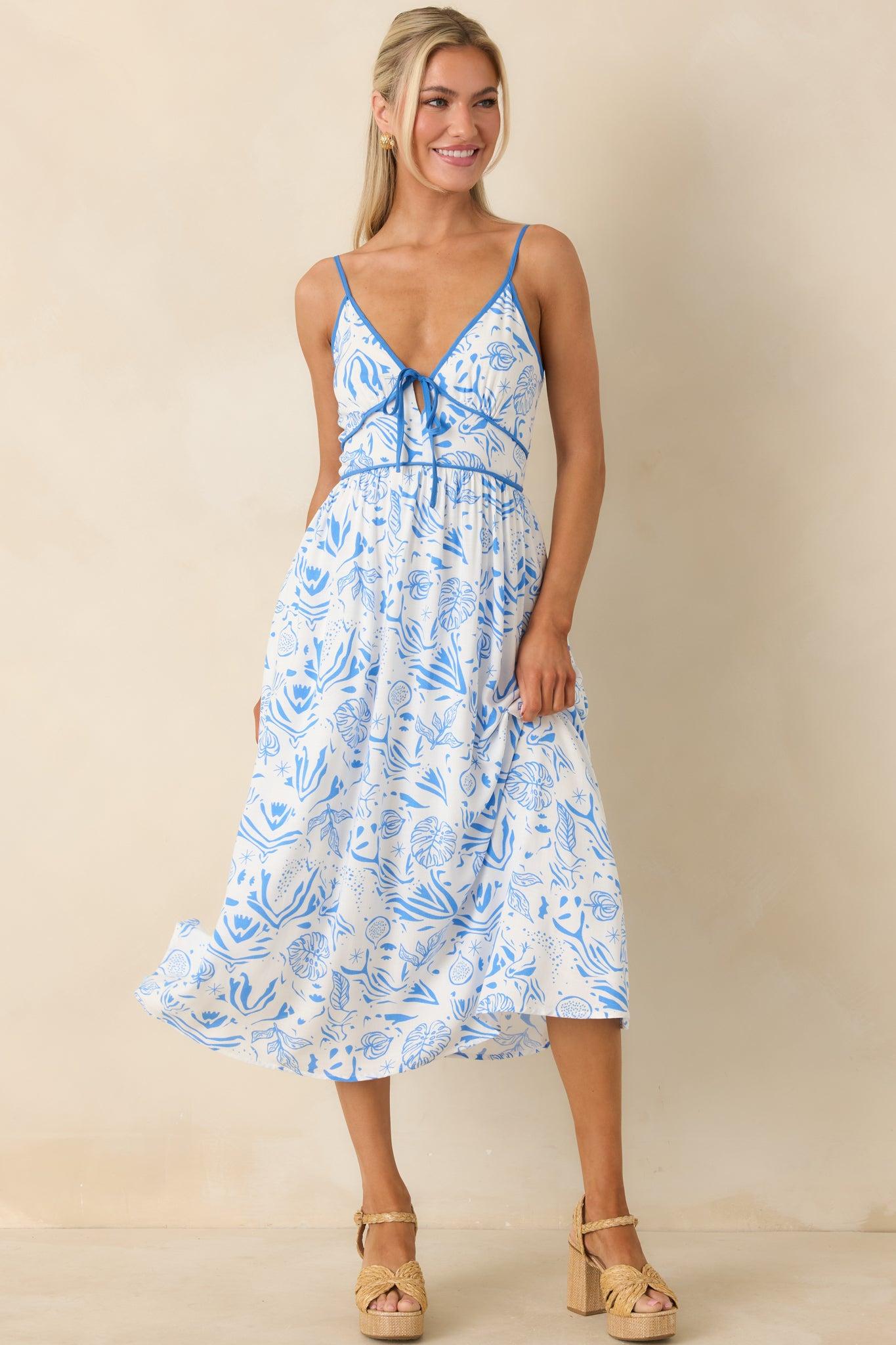 The Drifting With The Wind Blue Tropical Print Midi Dress captures that breezy, carefree feeling with every step. Its flowy silhouette and vibrant print make it a dreamy pick for beachside dinners or sunset strolls. This midi dress features a blue tropical print throughout, a v-neckline, adjustable spaghetti straps, blue piping trim details under the bust, a decorative self-tie bow at the center bust, smocked back panel, and functional pockets.
