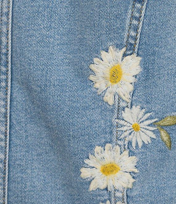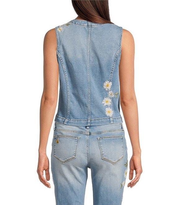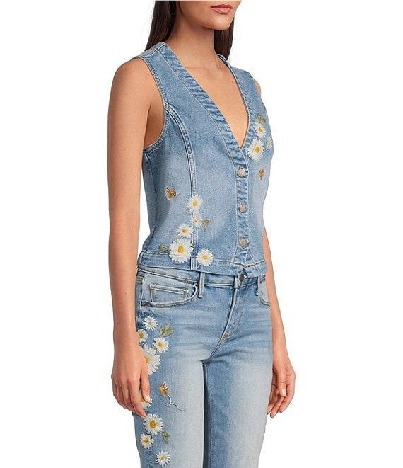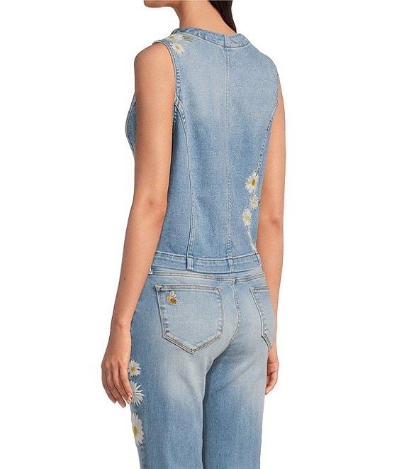 From Driftwood, this vest features: Stretch denim fabrication Daisy bee print V-neckline Sleeveless Straight hemline Button front closure Approx. 20.5" length , from top back to hem Cotton/polyester/spandex Machine wash/tumble dry low or line dry Imported.