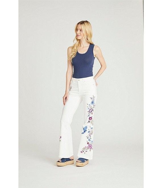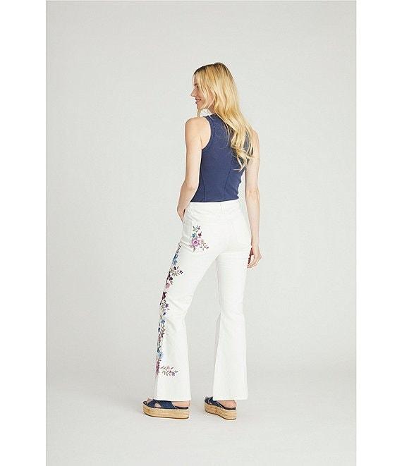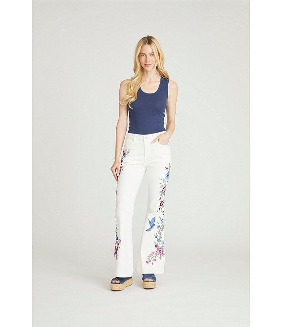 From Driftwood, these jeans feature: Stretch denim fabrication High rise Wide leg silhouette Belt loops 5 pocket styling High rise Embroidered bird details Full length Front button and zipper closure Approx. 32.5" length Cotton/polyester/spandex Machine wash Imported.