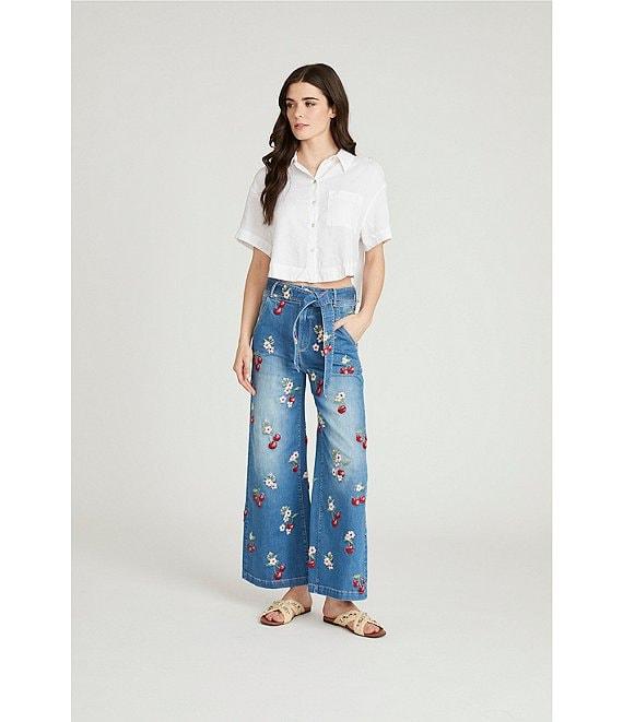 From Driftwood, these jeans feature: Stretch denim fabrication Wide leg silhouette Embroidered cherries Self tie belt Functional pockets Pant inseam in inches 28" Double button, zip fly Cotton/polyester/spandex Machine washable Imported.
