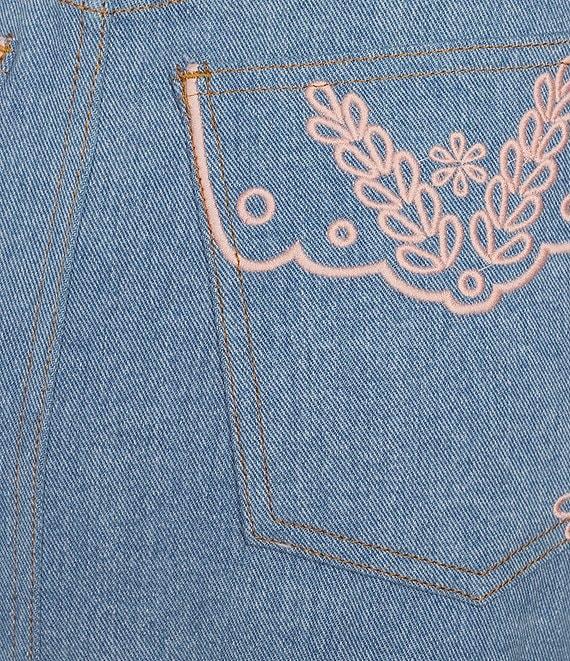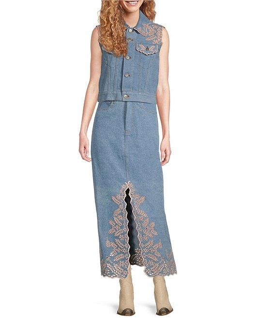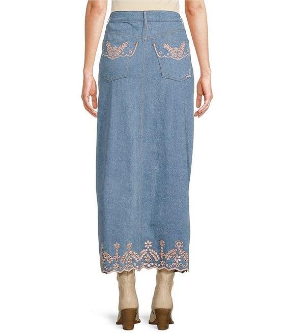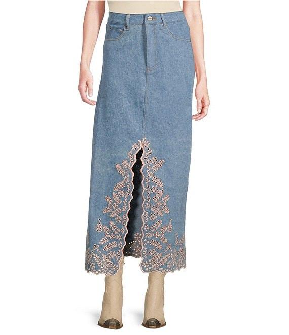 From Driftwood, this skirt features: Denim fabrication Delicate eyelets & floral embroidery High rise waistline Belt loops for styling 5 pocket styling Front split A-line silhouette Straight hemline Button front fly closure Approx. 37" length Cotton/spandex Machine wash/dry flat Imported.