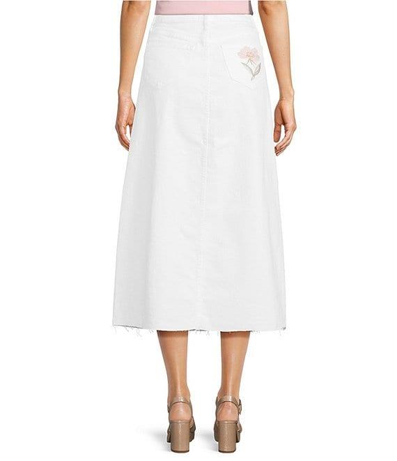 From Driftwood, this skirt features: Stretch denim fabrication Garden rose embroidery A-line silhouette High-rise waist Belt loops Front button and zipper closure Approx. 37" length Cotton/polyester/spandex Machine wash Imported.