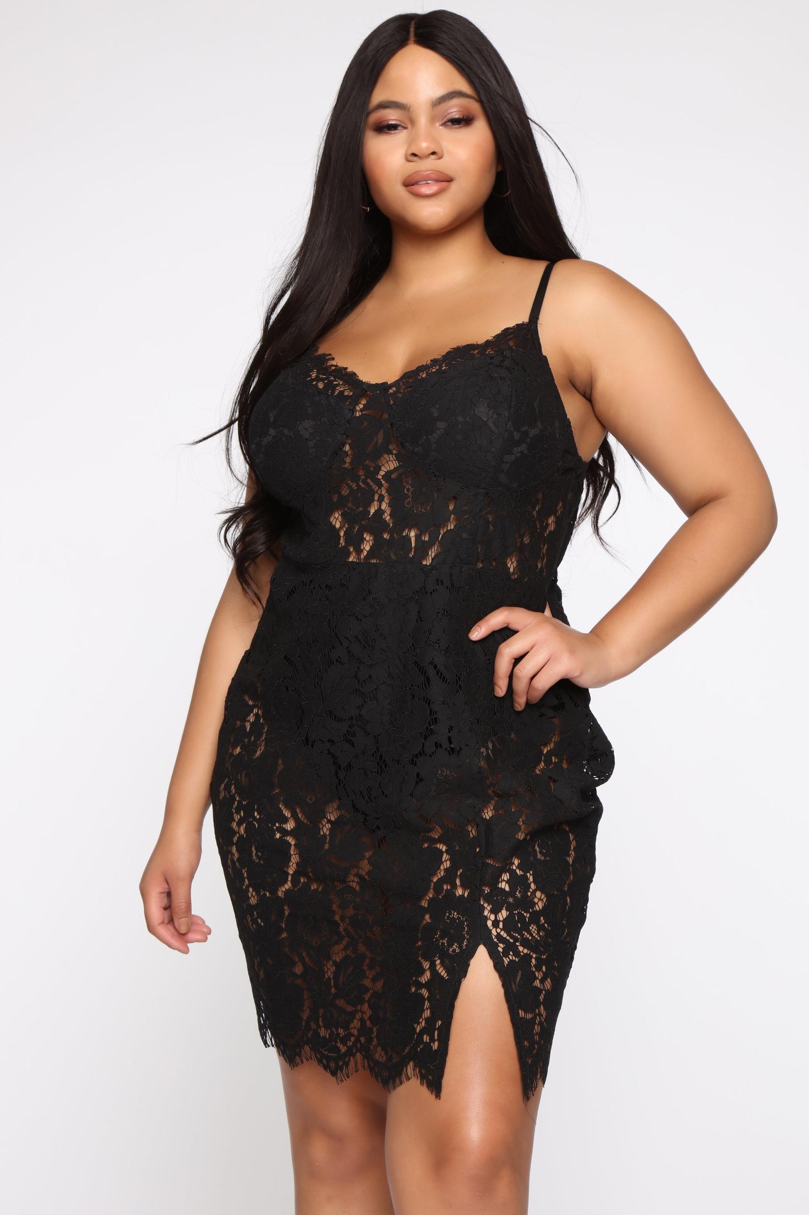 Available In Black. Lace Dress Adjustable Spaghetti Straps Panty Lining Snap Closure Back Zipper Final Sale 55% Cotton 45% Nylon Lining: 95% Rayon 5% Spandex Imported Available In Plus Sizes