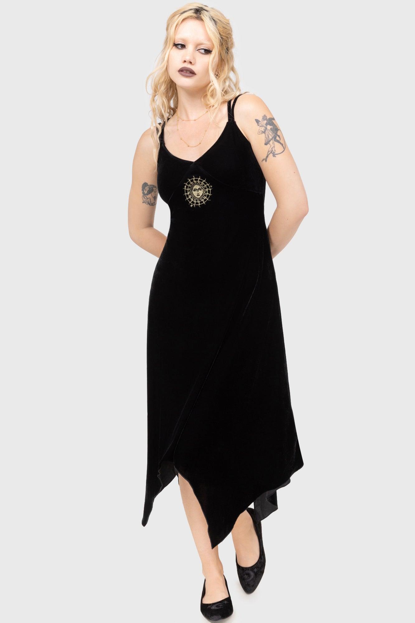 DUSKMOURN- Soft-touch velvet fabric with slight stretch.- Adjustable double shoulder straps.- Flattering V-neckline at the front.- Asymmetric hem for added movement and shape.- Front embroidery detail for a statement finish.- Designed in Brighton, England.Model is 5'9 and wears a size XS.With KILLSTAR branding, 95% Polyester 5% Elastane.Machine wash cold (30°c) / Do not bleach / Do not tumble dry / Do not iron / Do not dry clean. Imported.