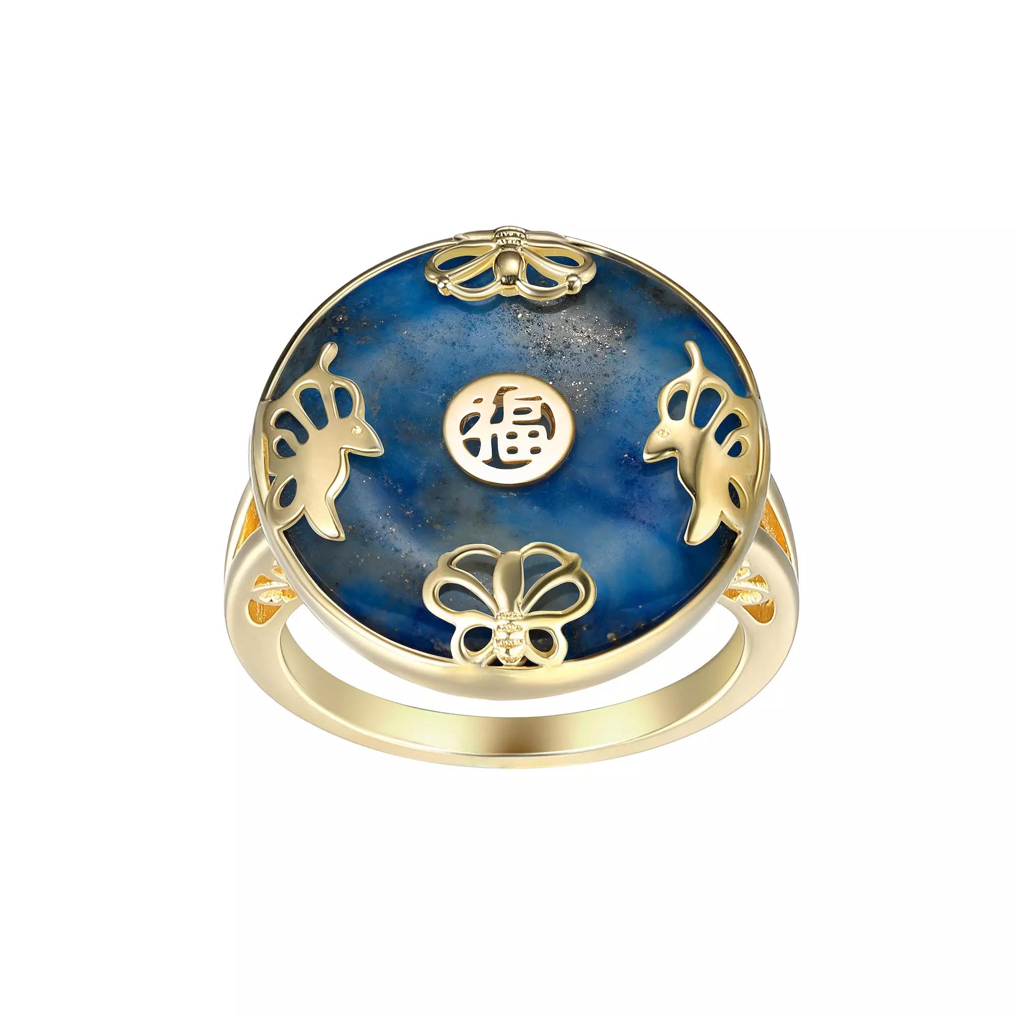 Elegantly decorated with flower and butterfly details, and the Chinese symbol for "good fortune," this lapis lazuli ring beautifully complements your wardrobe. Elegantly decorated with flower and butterfly details, and the Chinese symbol for "good fortune," this lapis lazuli ring beautifully complements your wardrobe. Width: 18 mm Metal: sterling silver Plating: 18k gold Finish: polished Packaging: boxedSTONE DETAILS Center stone size: 18 mm x 4 mm Shape: cabochon, round Color: Blue. Gender: female. Age Group: adult. Material: Gold Over Sterling.