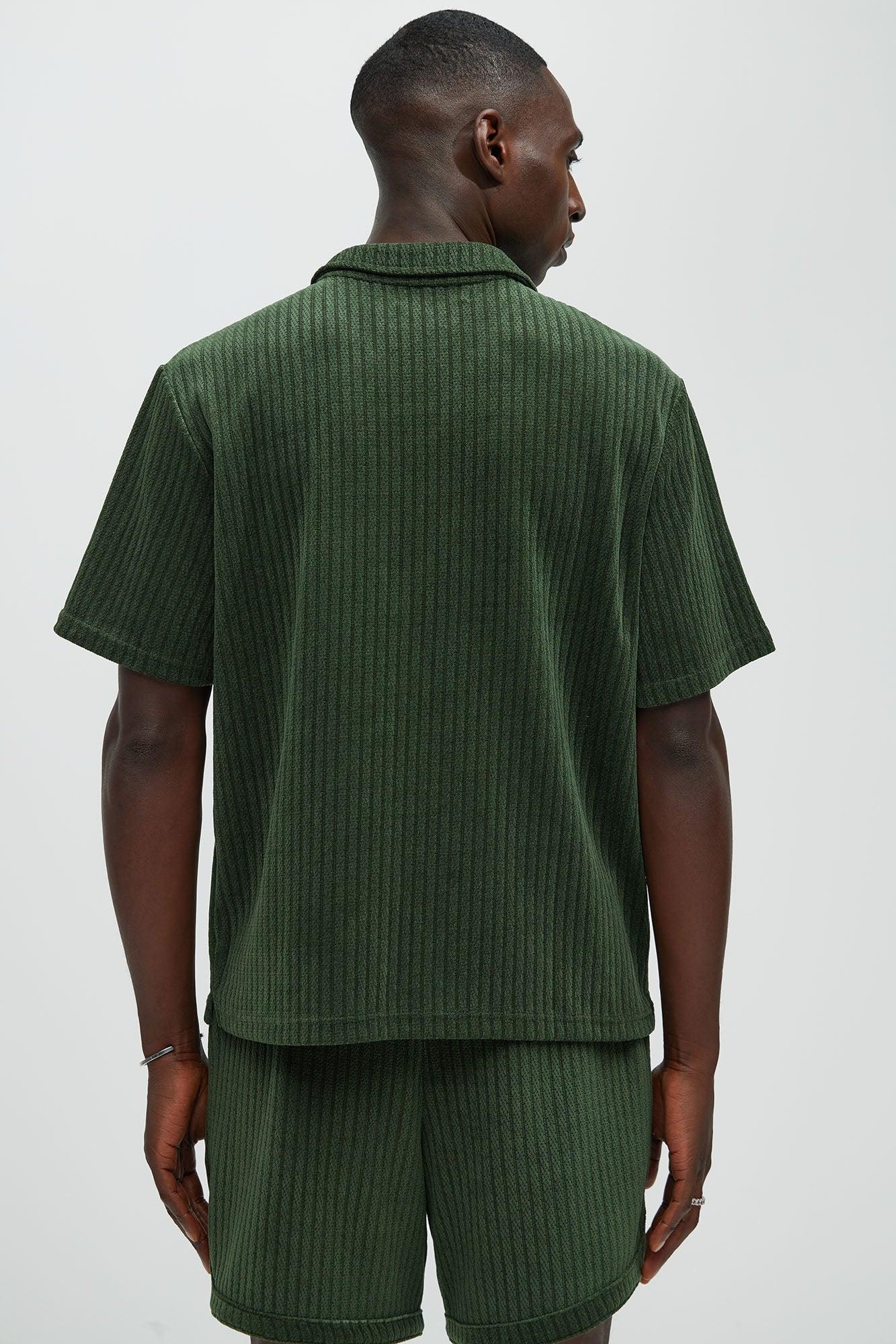 Available In Green and Off White Fold Down Collar Short Sleeve 95% Polyester, 5% Spandex Pair With "Easton Textured Shorts" Imported California Proposition 65 WARNING: Cancer and Reproductive Harm - www.P65Warnings.ca.gov.