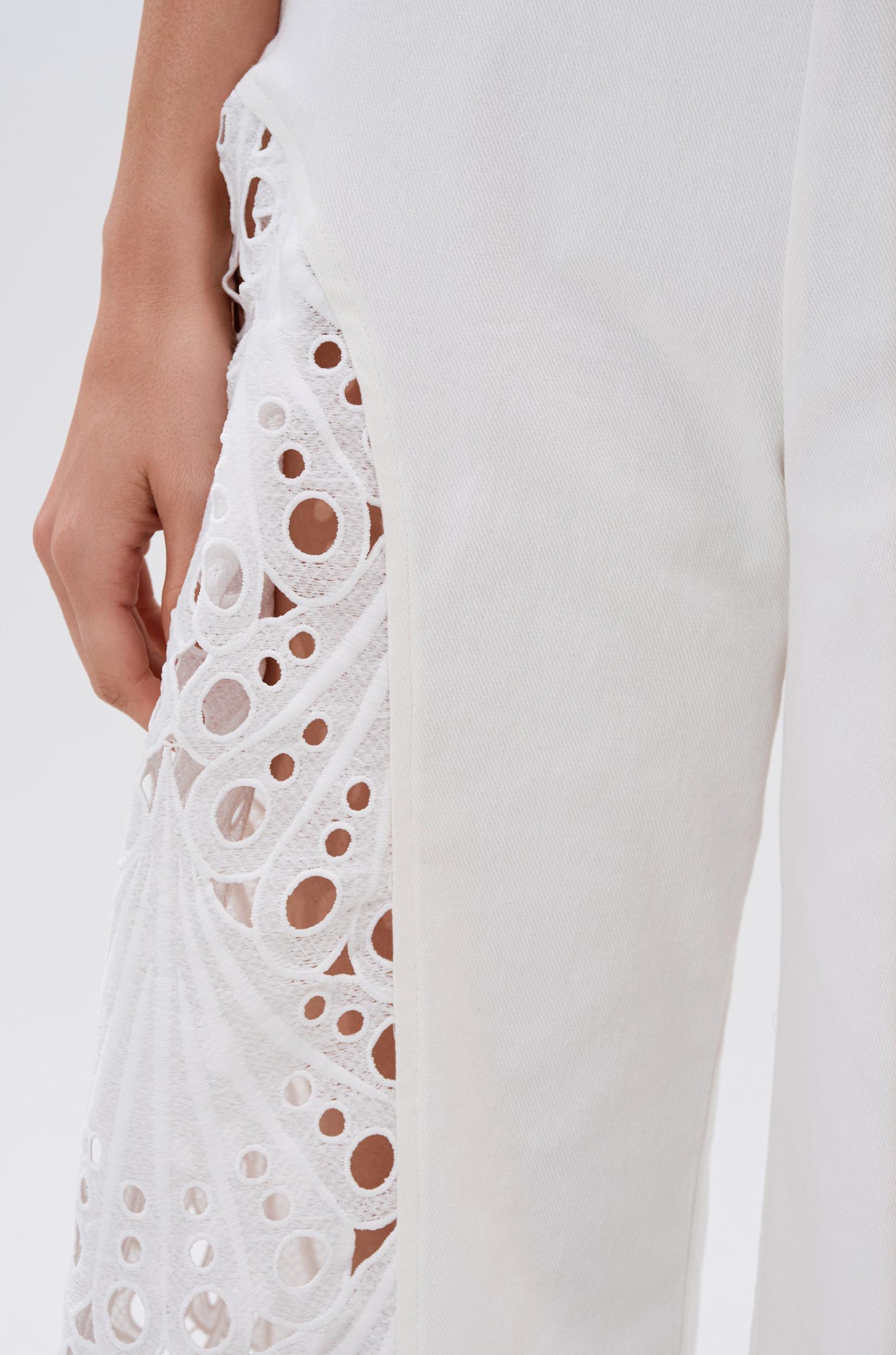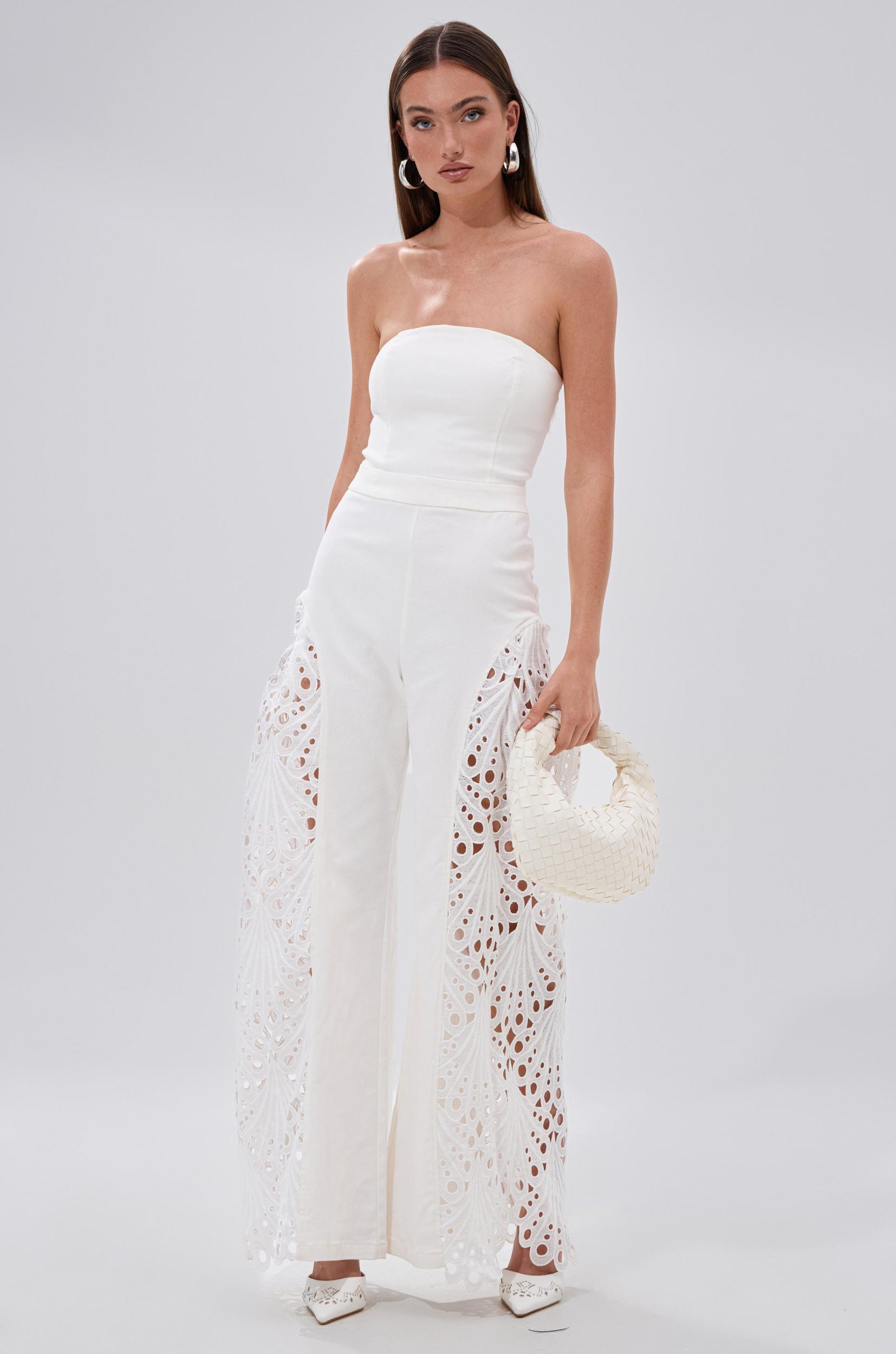 Take a chill pill in The AKIRA Label Easy Breezy Denim Jumpsuit In White. Crafted from semi-stretchy, white denim, this sweet one-piece features a cinched bodice, a strapless neckline with inner elastic trim, adorable lace cut out panels on each side of the legs with delicate eyelet detailing, and a back zipper closure. Complete with a wide-leg silhouette. Pair with platform sandals and rattan accessories for an elevated finish. - Self: 97% Polyester 3% Spandex, Contrast: 100% Polyester, Lining: 100% Polyester- Hand Wash Cold- Some Stretch- Imported (all measurements approximate from size small)- 51” Chest to Hem- 31.5” Inseam Product ID: 1063794