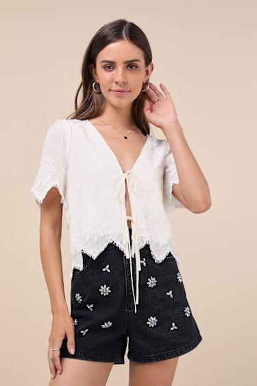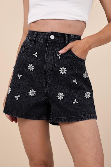 Bring the Lulus Easygoing Glow Black Denim Rhinestone High-Rise Shorts along to your next festival adventure to ensure your look is iconic! Sturdy cotton denim shapes these too-cute shorts that feature a high-rise design with belt loops, a classic five-pocket cut, and a top button closure above a hidden zip fly. The relax-fit silhouette boasts dazzling rhinestone details that create flower-like shapes across the front for a stunningly fun finish.